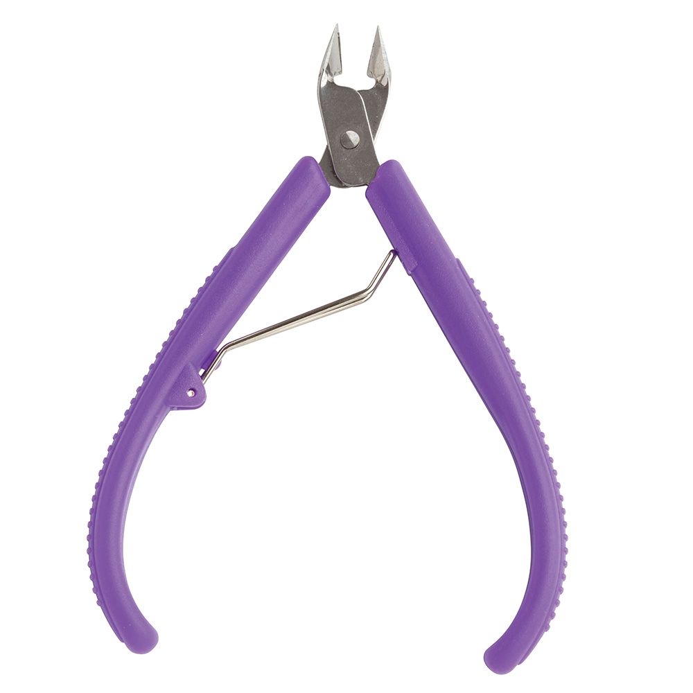 - Alicate de cutícula com cabo de plástico destinado para manicure.