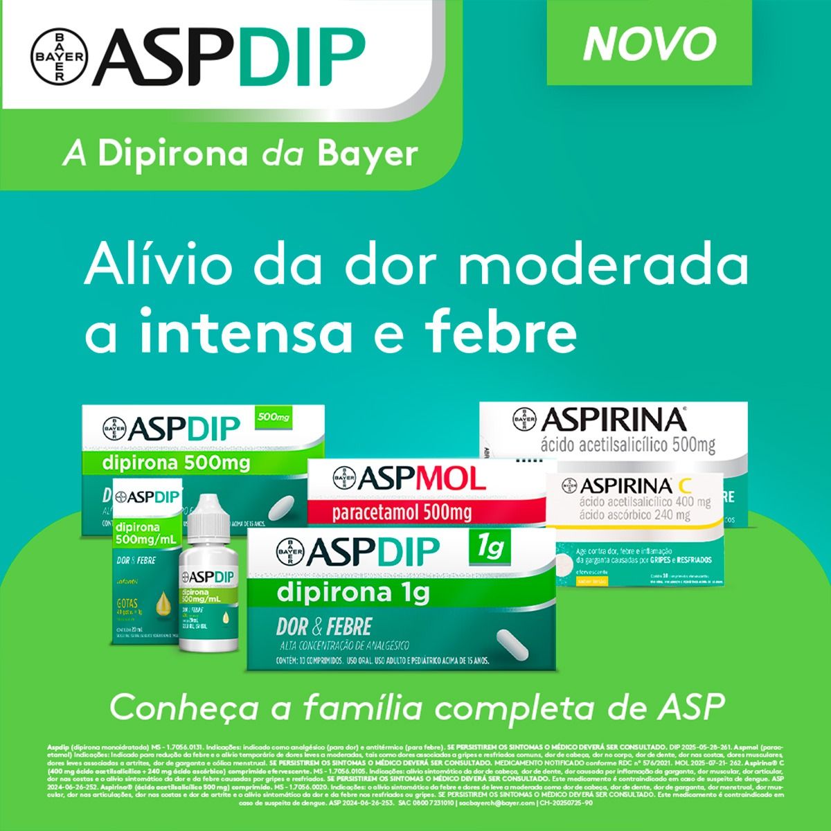Aspdip 500mg/ml Gotas Abacaxi 20ml Bayer é indicado para alívio rápido de dores e febre em adultos e crianças, possui sabor agradável e fácil administração. Consulte sempre a dose ideal para sua idade e necessidade, seguindo a orientação médica.