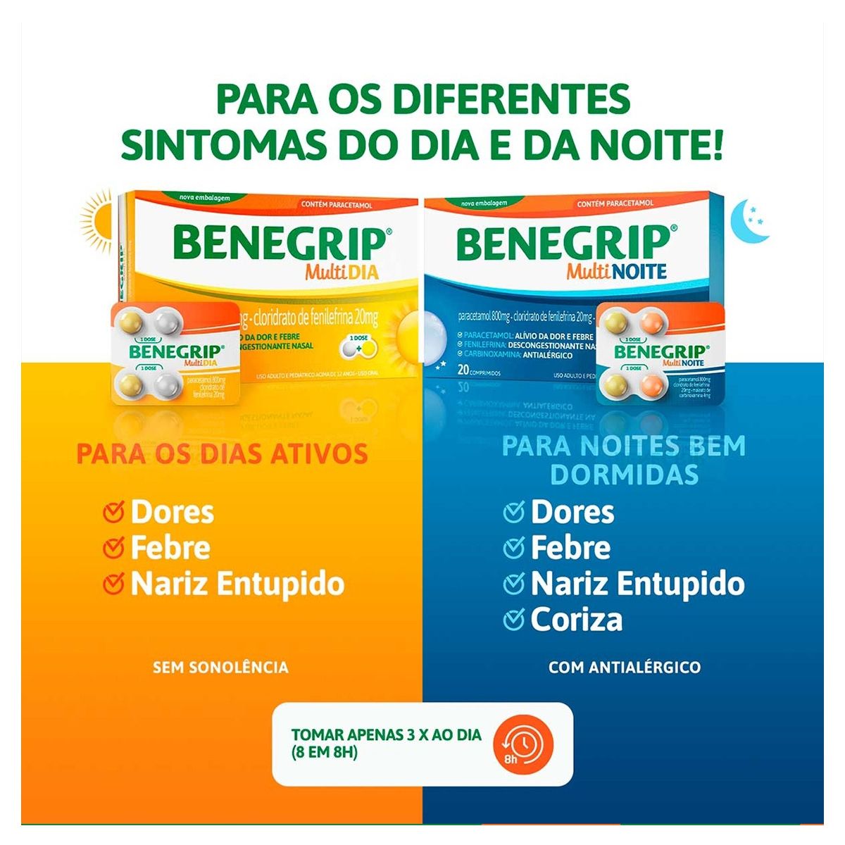 Benegrip Multi Dia alivia dor e febre sem sonolência, ideal para uso diurno. Atua como descongestionante nasal e é prático para transportar. -