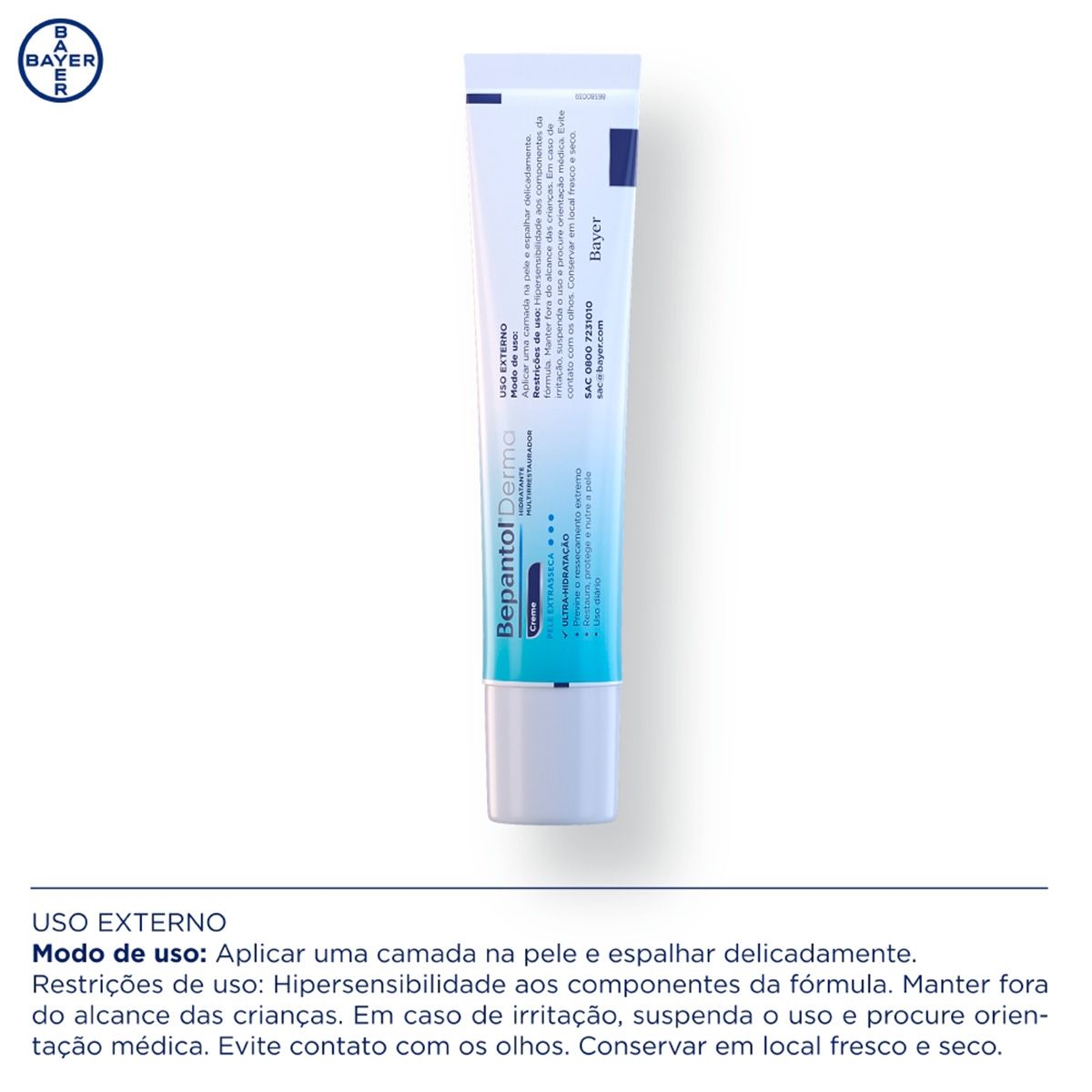 Este produto é indicado para regiões do corpo que precisam de hidratação intensa e cuidados especiais como os pés, calcanhares, cutículas, cotovelos, joelhos e também para tatuagens. O Bepantol Derma Creme Multirreparador está disponível em embalagem bisnaga de 40g.