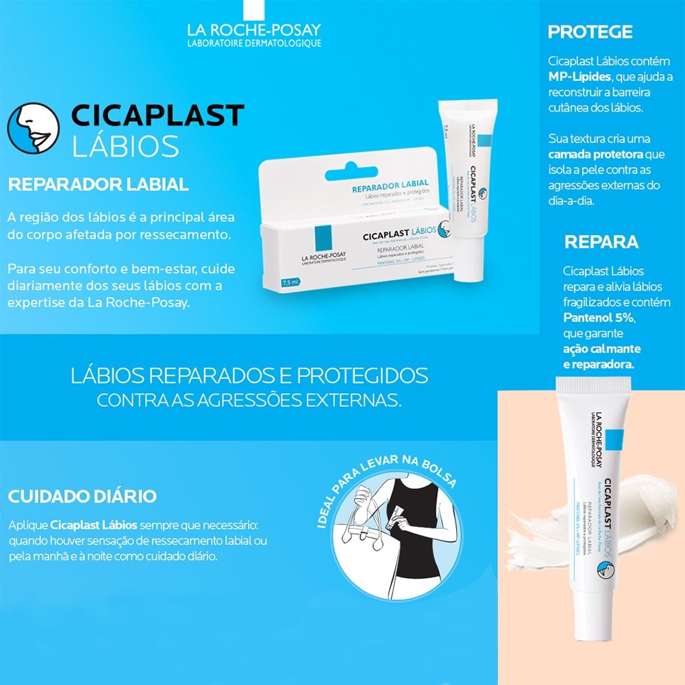 Reparador Labial Cicaplast da La Roche-Posay deixa os lábios hidratados, reparados e protegidos, prevenindo ressecamentos e rachaduras e permitindo uma regeneração eficaz da pele.