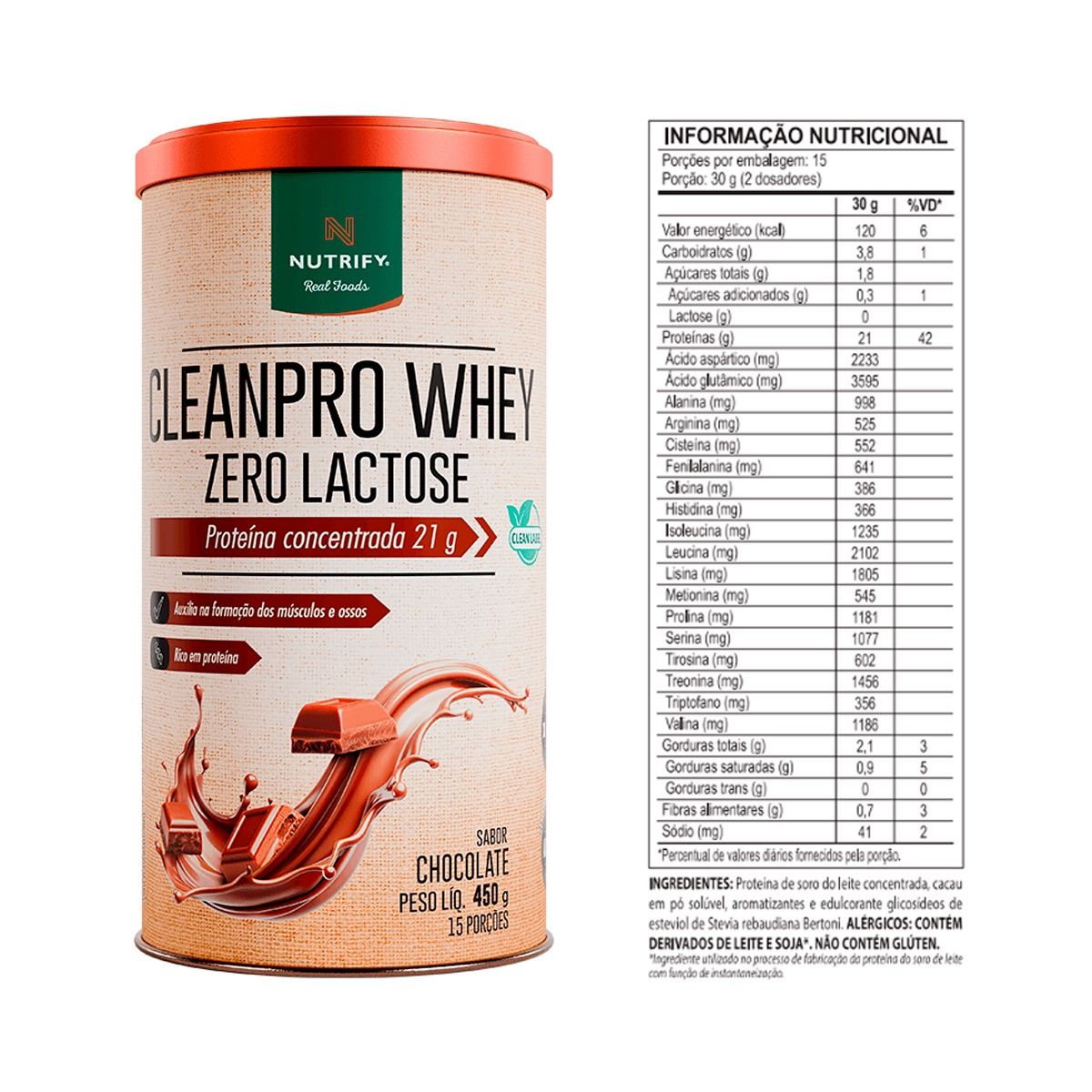 Serve para complementar a ingestão diária de proteínas, auxiliando no ganho e manutenção da massa muscular, na recuperação pós treino e no suporte nutricional geral. É indicado para atletas, praticantes de atividades físicas e pessoas intolerantes à lactose que desejam uma proteína leve e eficiente.Benefícios e diferenciais Cleanpro Whey Nutrify Real Foods Zero Lactose Chocolate 450g: