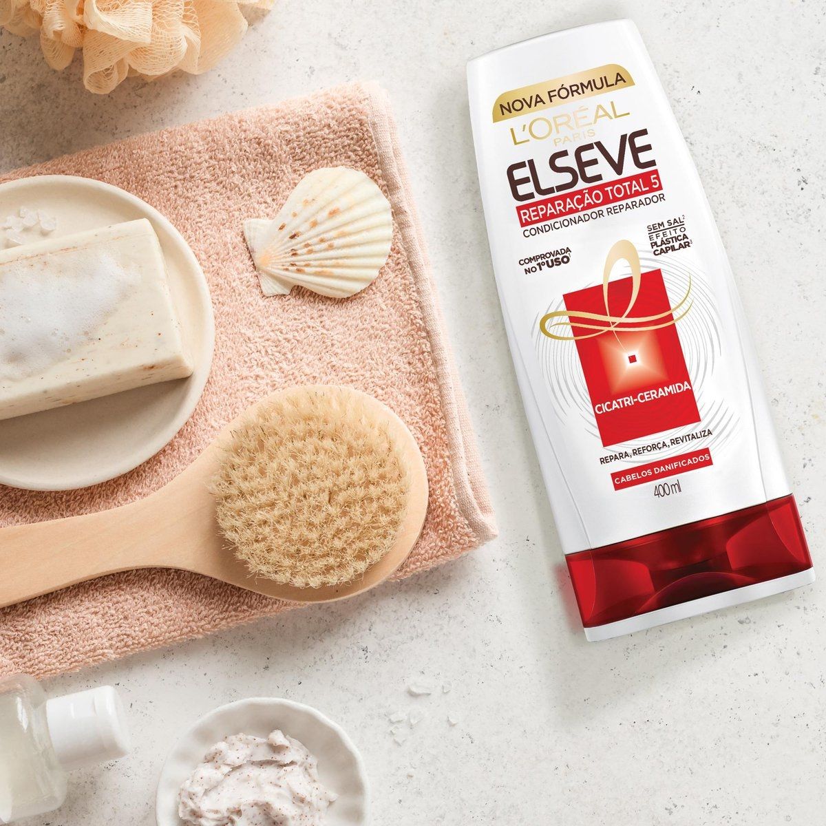A nova linha Elseve Reparação Total 5+ faz uma reparação total dos 5 danos que o cabelo pode ter, para um efeito de plástica capilar. São eles a quebra, a rigidez, a opacidade, o ressecamento e as pontas duplas.