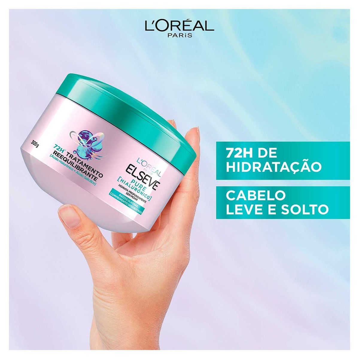 Raizes oleosas e pontas desidratadas? O Creme de Tratamento Elseve Hialurônico Pure 300g, é um tratamento Reequilibrante 72H , com a combinação de Ácido hialurónico + Ácido salicilico], hidrata intensamente a fibra capilar até as pontas por 72 horas sem pesar. Para um cabelo naturalmente brilhante, suave e cheio de movimento.