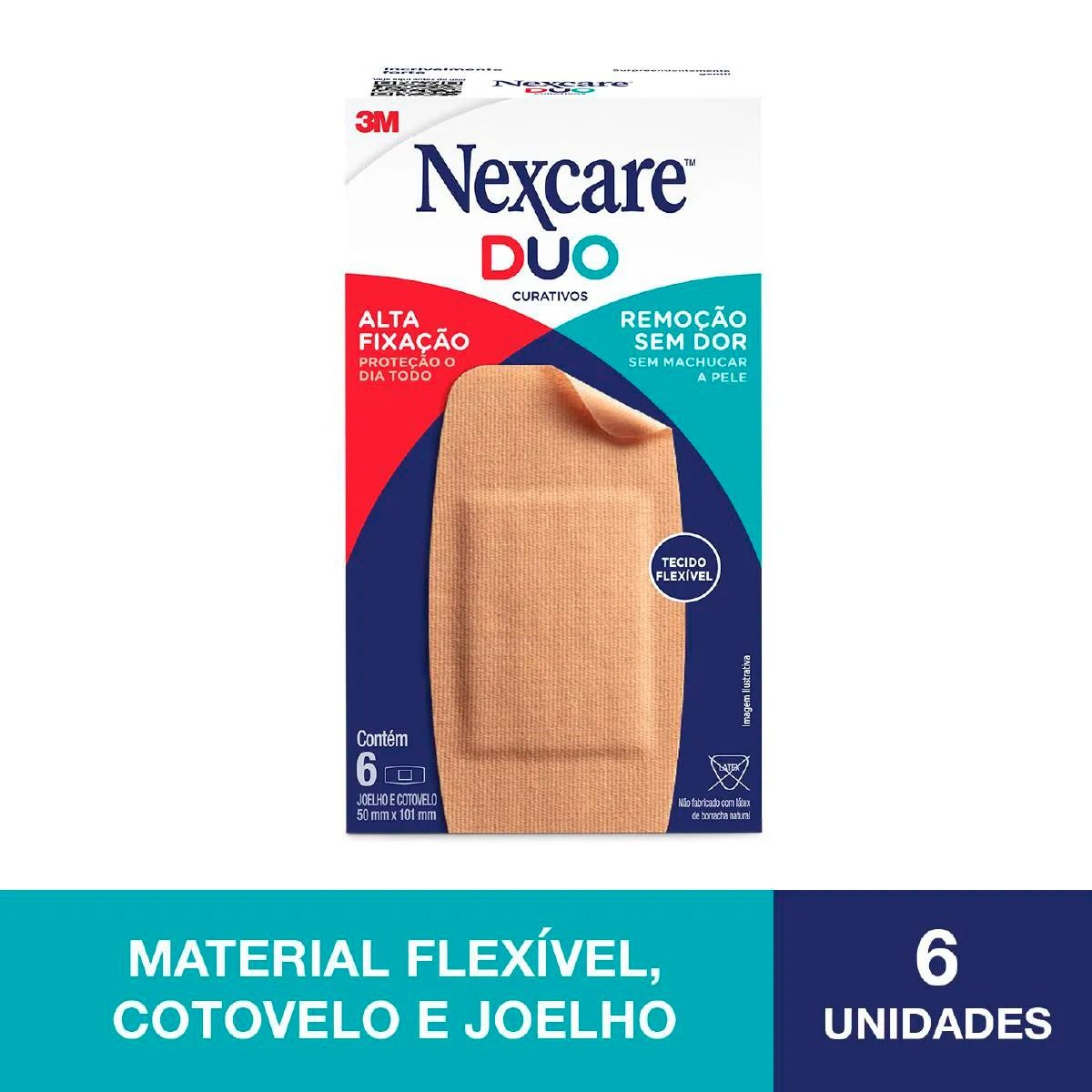 Nexcare Duo Joelho & Cotovelo é um curativo de alta permanência com tecnologia avançada de silicone patenteada em sua adesividade e tecnologia flexível que se move com você. Feito com almofada absorvente que não adere à ferida, ele é bastante confortável e suave, deixando a pele transpirar e sem deixar resíduos durante sua remoção. Este curativo ajuda a cobrir grandes ferimentos, sendo mais prático que gaze com fita, além de ser resistente à água e oferecer mais proteção. Não fabricado com látex de borracha natural.Benefícios e diferenciais do curativo Nexcare Duo Joelho & Cotovelo