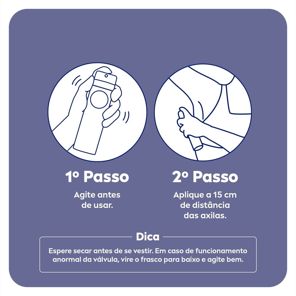 Agite antes de usar e aplique a 15 cm das axilas. Espere secar antes de se vestir e não use se a pele estiver irritada ou lesionada. -