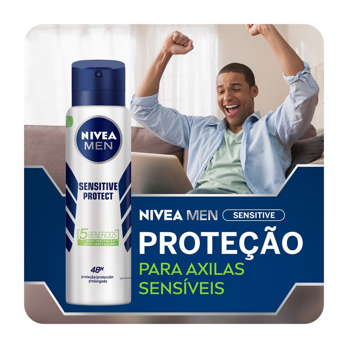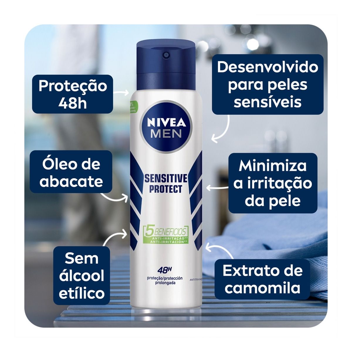 O Desodorante Aerossol Nivea Men Sensitive Protect 150ml é ideal para homens com pele sensível. Com proteção de 48h sem álcool, combate o suor, odor e irritações graças à tecnologia Comfort Boost e extratos suaves de camomila e abacate. Aplique a 15cm para melhor resultado.