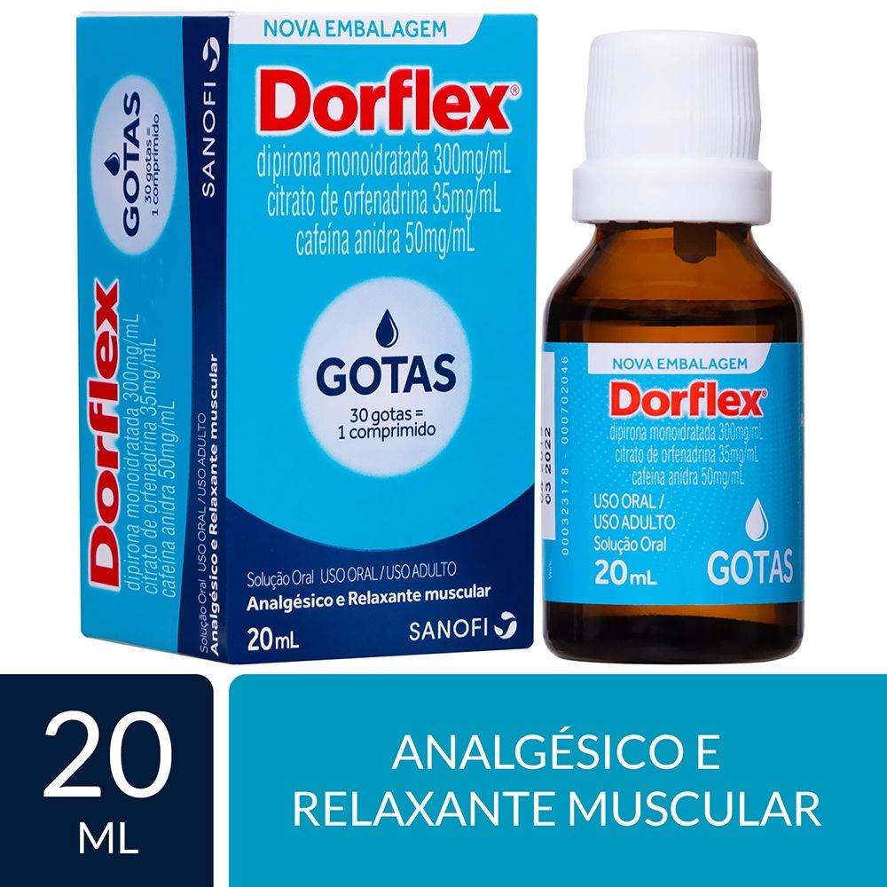 Cada mL de Dorflex corresponde a 30 gotas e 1 gota equivale a 10 mg de dipirona monoidratada, 1,17 mg de citrato de orfenadrina e 1,67 mg de cafeína.