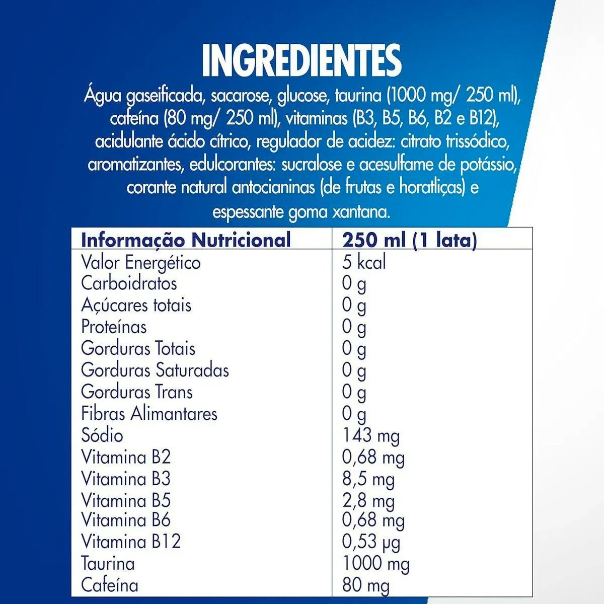 Os principais ingredientes são Taurina, Glucoronolactona, vitaminas do grupo B e 80 mg de Cafeína, além de ter sabor de frutas vermelhas e ser sem açúcar. -