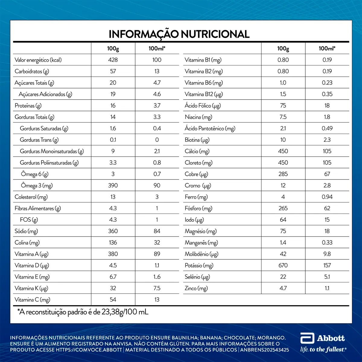 | Composição | Com Ácido Fólico, Com Biotina, Com Cálcio, Com Carboidrato, Com Cobre, Com Cromo, Com Ferro, Com Fibras, Com Fósforo, Com Iodo, Com Magnésio, Com Maltodextrina, Com Manganês, Com Niacina, Com Potássio, Com Proteína, Com Selênio, Com Sódio, Com Vitamina A, Com Vitamina B1, Com Vitamina B2, Com Vitamina B3, Com Vitamina B5, Com Vitamina B6, Com Vitamina B7, Com Vitamina B9, Com Vitamina C, Com Vitamina D, Com Vitamina E, Com Vitamina K, Com Zinco |