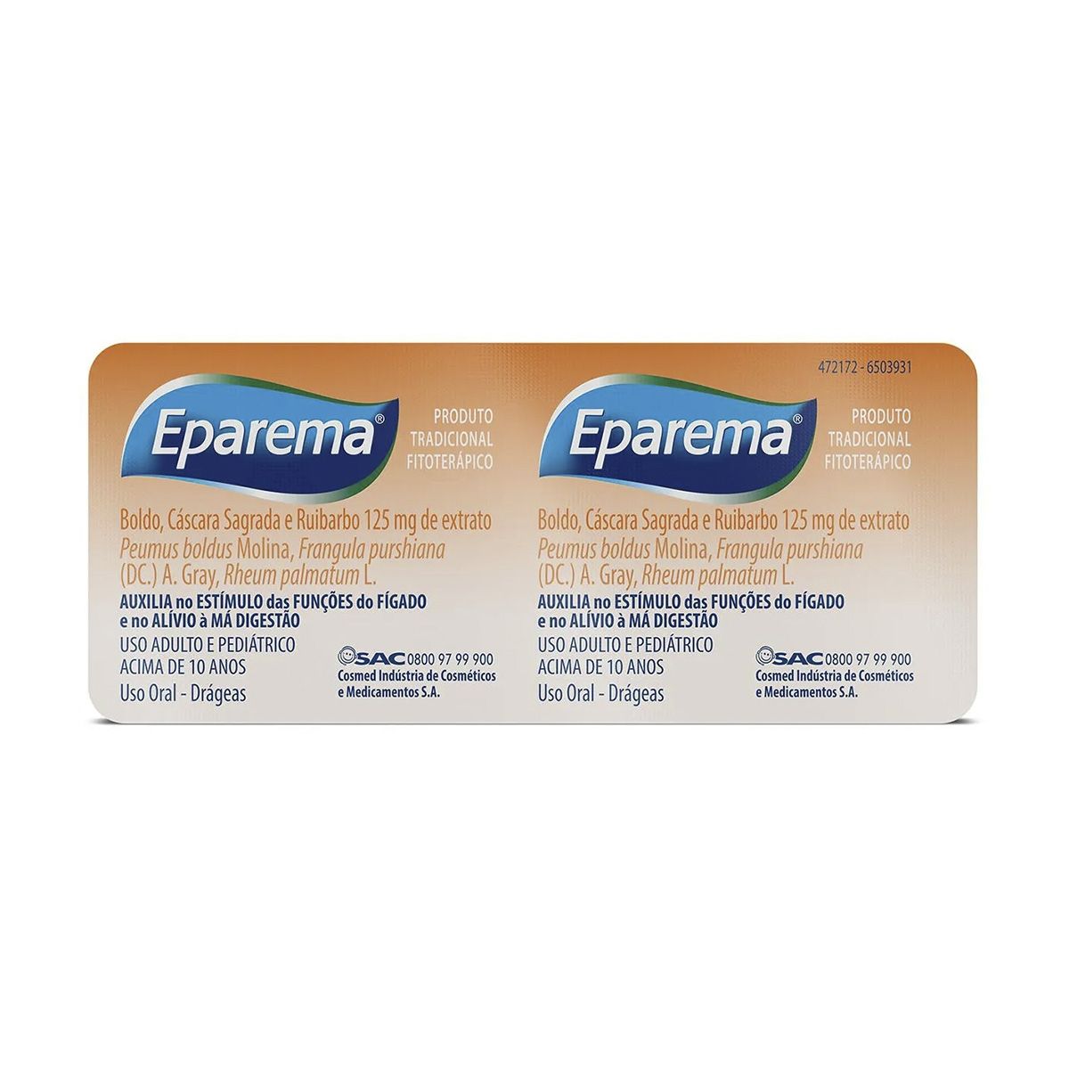 Eparema com 10 Drágeas é ideal para aliviar a má digestão e cuidar do fígado, graças a uma combinação eficaz de boldo, cáscara sagrada e ruibarbo. Ajuda no trânsito intestinal e no suporte das vias biliares. Escolha este fitoterápico caso busque um aliado natural para a saúde digestiva. Recomenda-se a dosagem correta para adultos e crianças acima de 10 anos, sempre respeitando as instruções e consultar um profissional de saúde caso necessário. Opte por Eparema se busca um produto de referência para cuidar do seu sistema digestivo de forma natural e confiável.