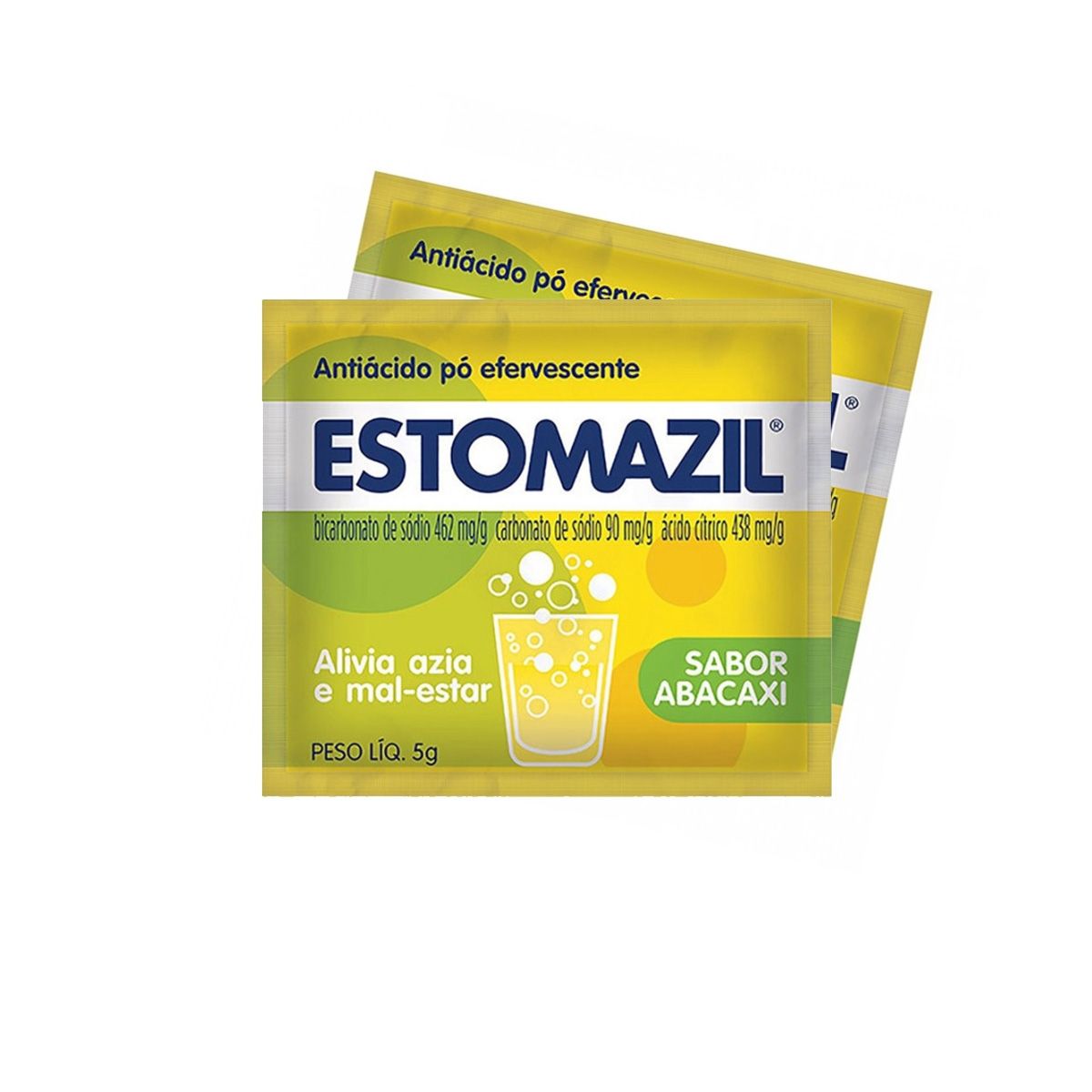 Estomazil Antiácido Pó Efervescente. Está sempre à mão, seja no trabalho ou no passeio em família, é só dissolver um Sachê (5g) na água e você garante eficácia imediata contra azia, má digestão e estufamento - Disponível nos sabores Abacaxi, Guaraná, Laranja e Sem Sabor.