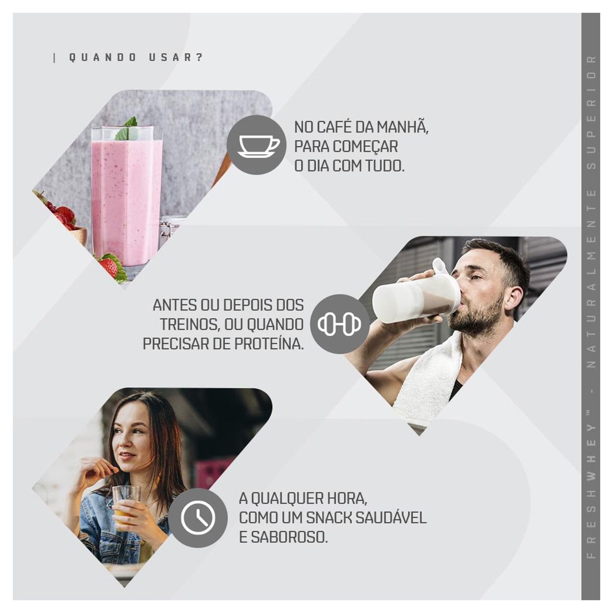 FreshWhey é uma nova categoria de proteínas, totalmente naturais, feitas com frutas e nuts de verdade, que proporcionam sabores reais, com uma fórmula rigorosamente limpa e pura. Apesar das variadas opções de suplementos de proteínas no mercado, encontrar qualidade e sabor, unidos em uma fórmula limpa e pura, é um desafio.