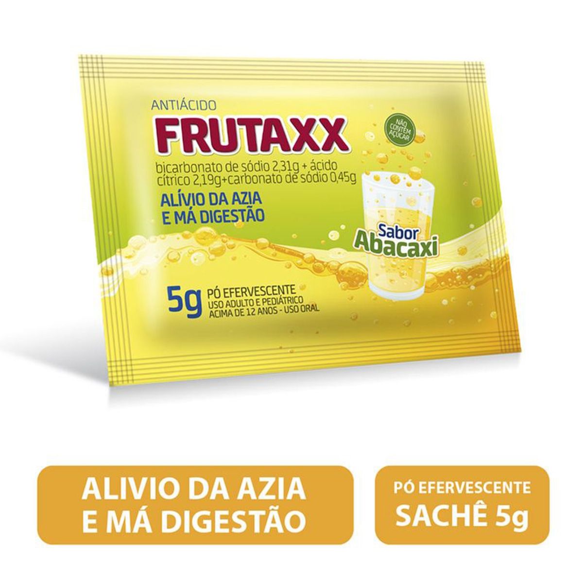 Frutaxx Efervecente 5g é um antiácido em sachê sabor abacaxi que alivia azia e má digestão ao ser dissolvido em água. -