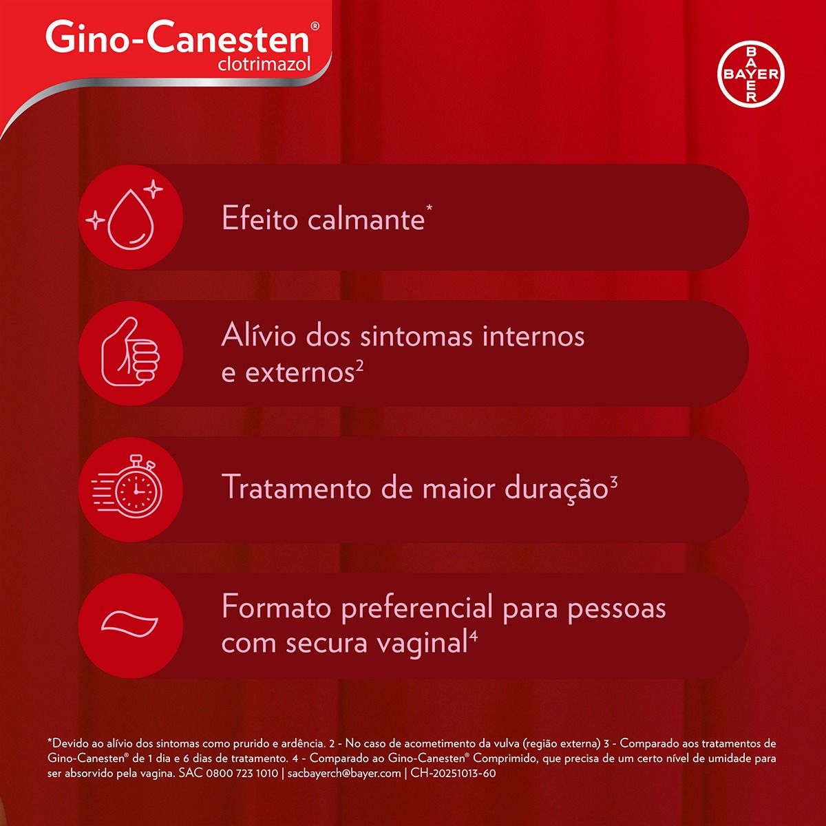 Gino-Canesten® creme vaginal é um medicamento utilizado para tratar infecções da vagina causadas por fungos. A substância ativa, clotrimazol, inibe o crescimento e a multiplicação das células dos fungos e de algumas bactérias.