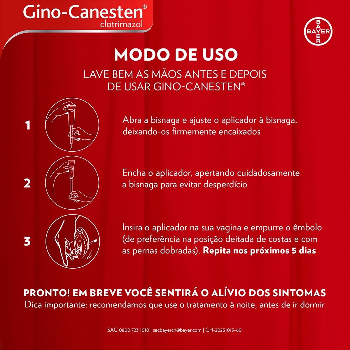 Utilize Gino-Canesten® creme vaginal conforme instruções de aplicação abaixo. Fale com o seu médico ou farmacêutico se tiver dúvidas.