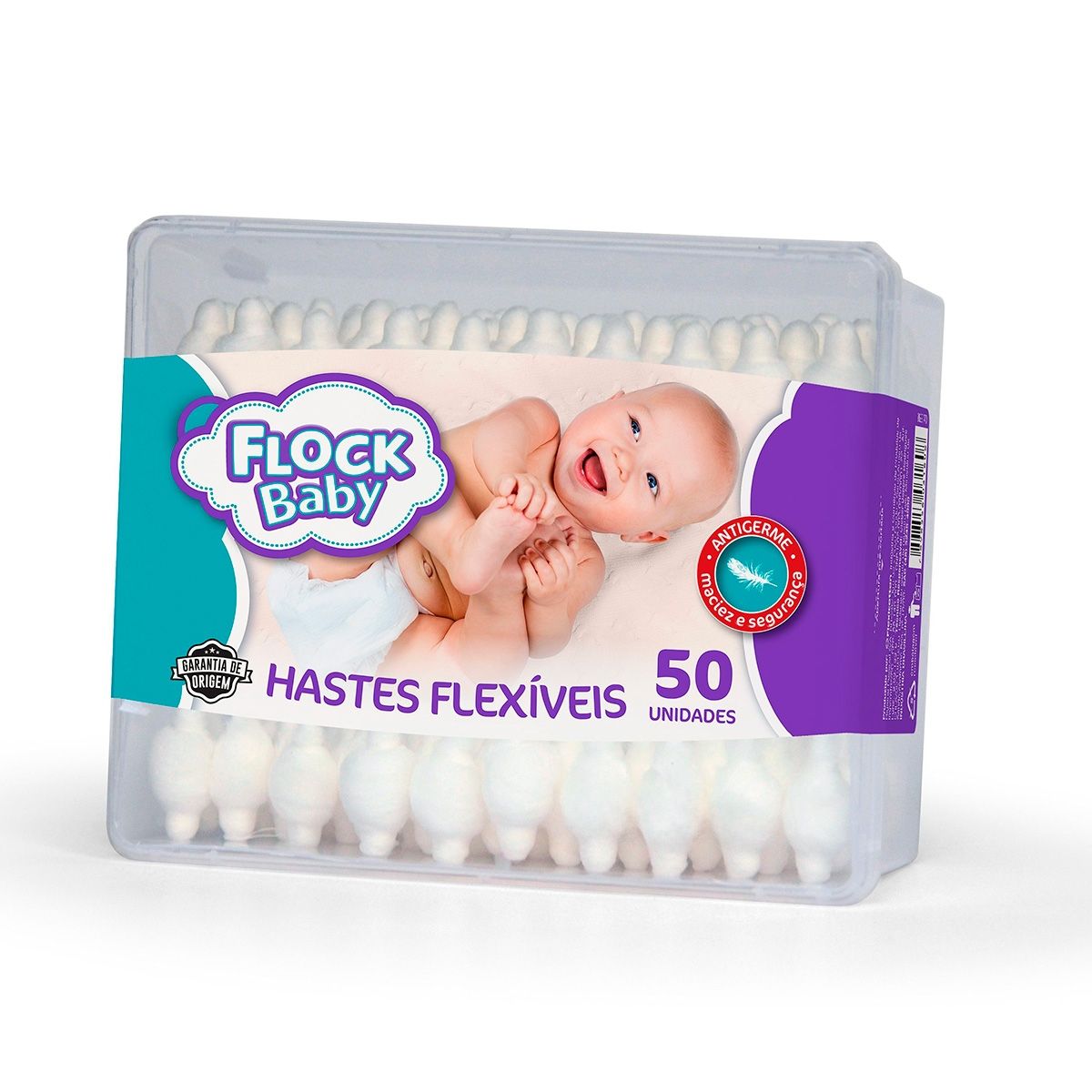 As Hastes Flexíveis Flock Baby, com 50 unidades, são essenciais para a higiene segura do bebê. As pontas mais gordinhas de algodão macio evitam lesões, protegendo ouvidos e partes delicadas do corpo. Escolha ideal para cuidar de ouvidos, olhos, e mais.