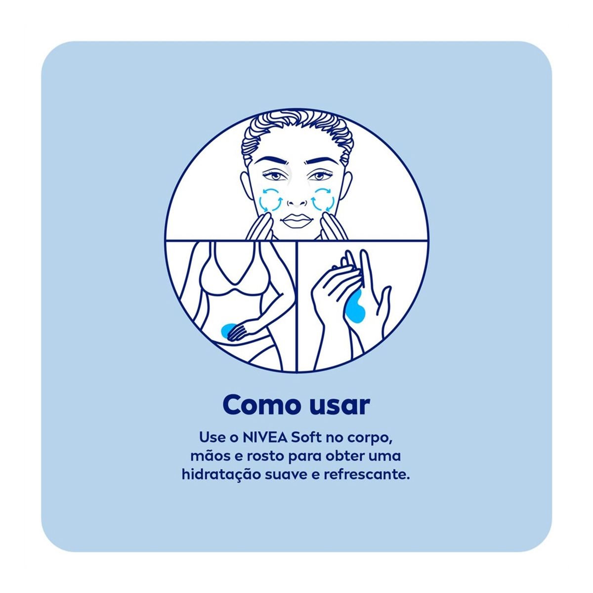 O Hidratante Nivea Soft é indicado para todos os tipos de pele, promovendo rápida absorção e mantendo a pele macia e hidratada diariamente, sem deixar resíduos oleosos. -