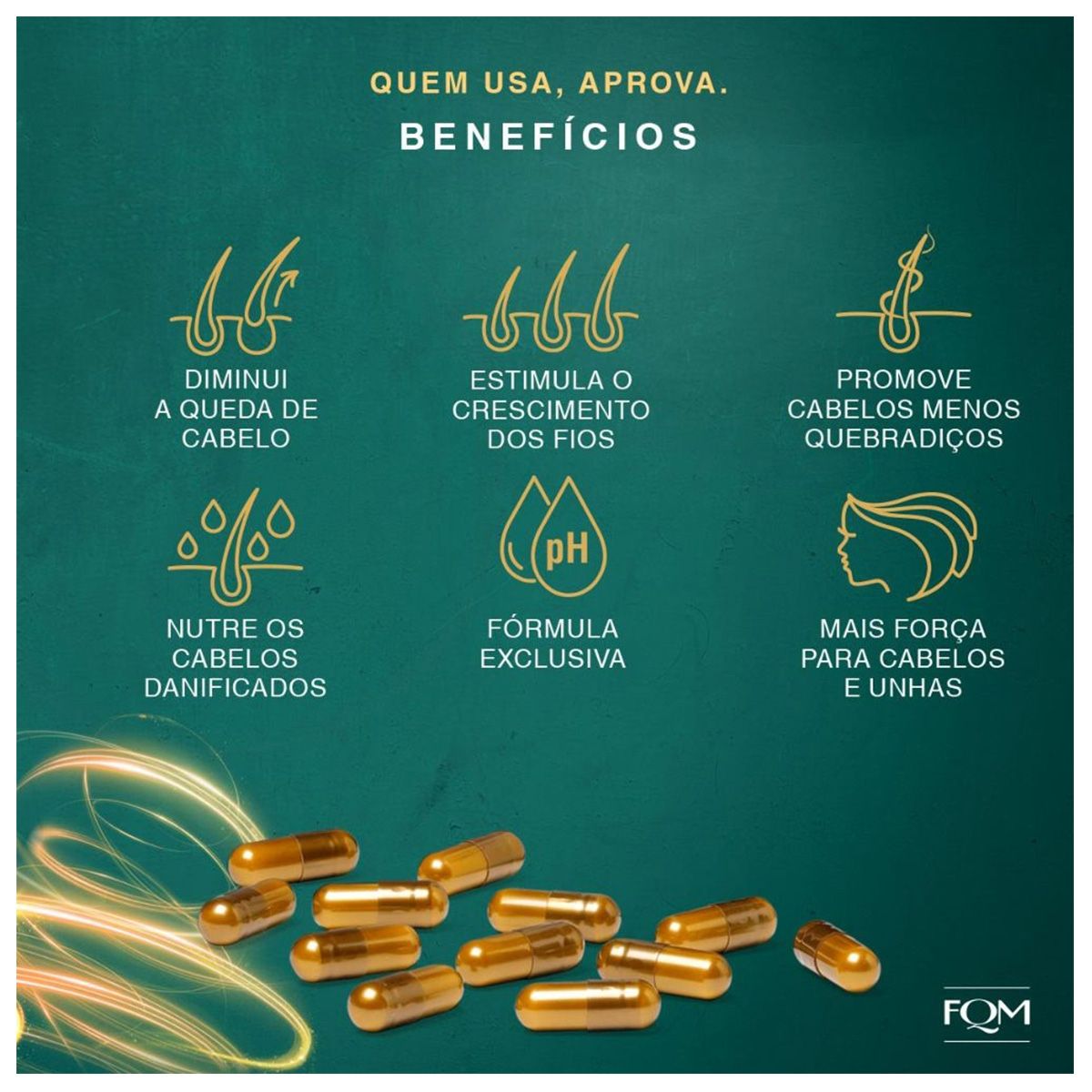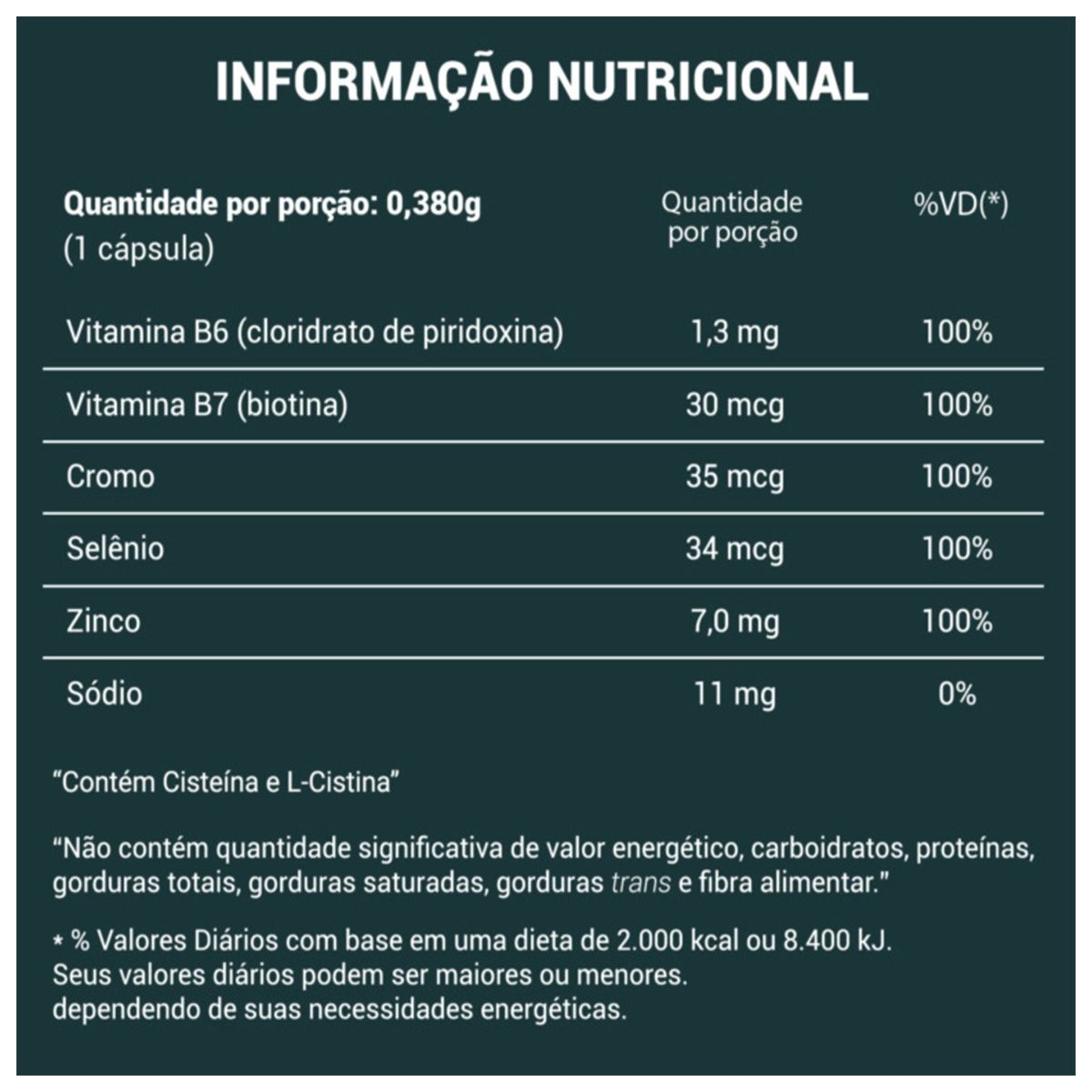 Possui a formula mais completa do mercado de nutraceuticos para o tratamento da queda capilar. Além da Biotina (vit. B7), Piridoxina (vit. B6), Selênio, Cromo e Zinco, contém colágeno hidrolisado e a presença de dois aminoácidos responsáveis pela formação da queratina do cabelo, que são a L-cistina e a Cisteína. Isso possibilita mais força, brilho, resistência e vitalidade aos fios.alem de fortalecer as unhas.