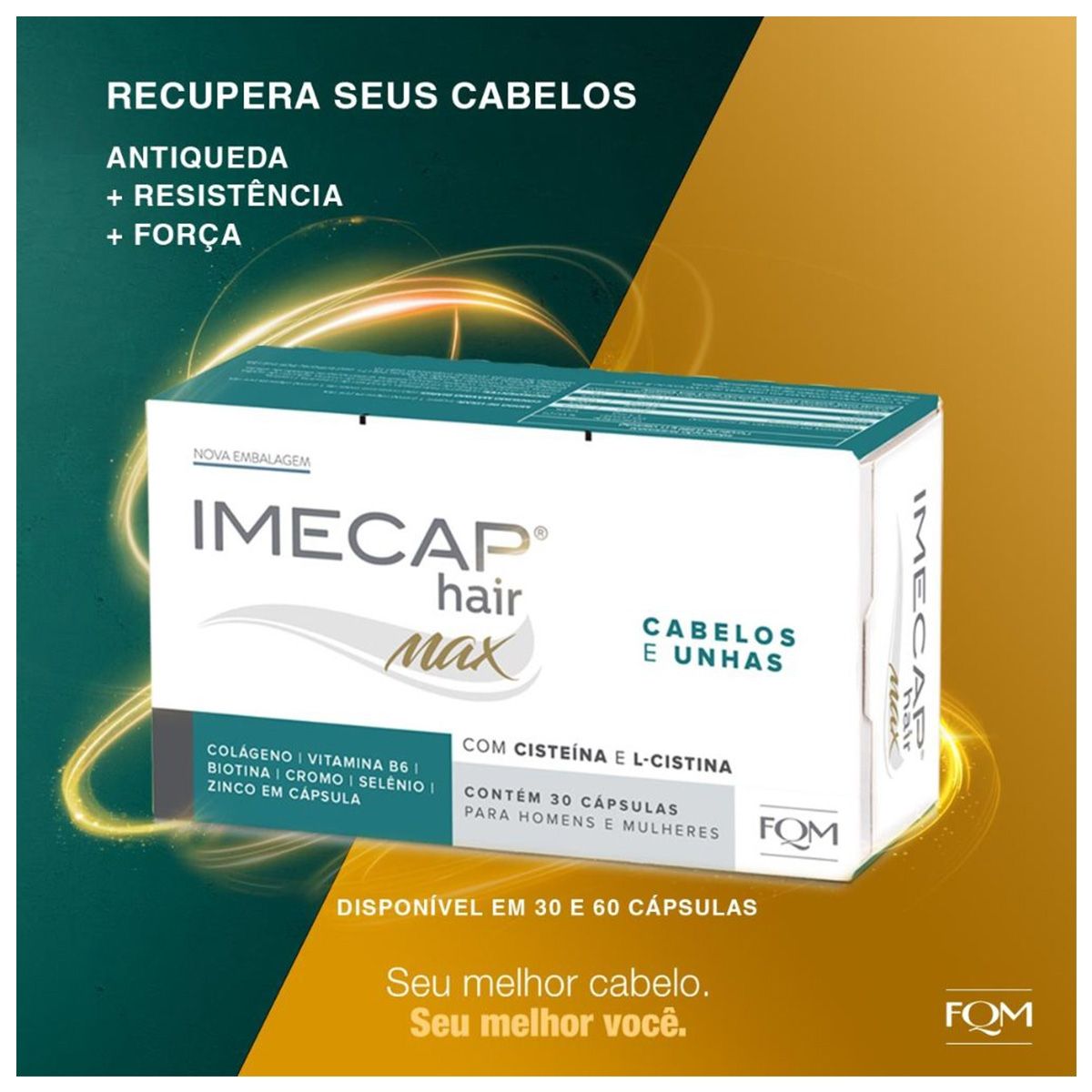 O Imecap Hair Max contém biotina, piridoxina, selênio, cromo, zinco, colágeno hidrolisado, L-cistina e cisteína, todos essenciais para fortalecer os cabelos e melhorar a saúde das unhas. -