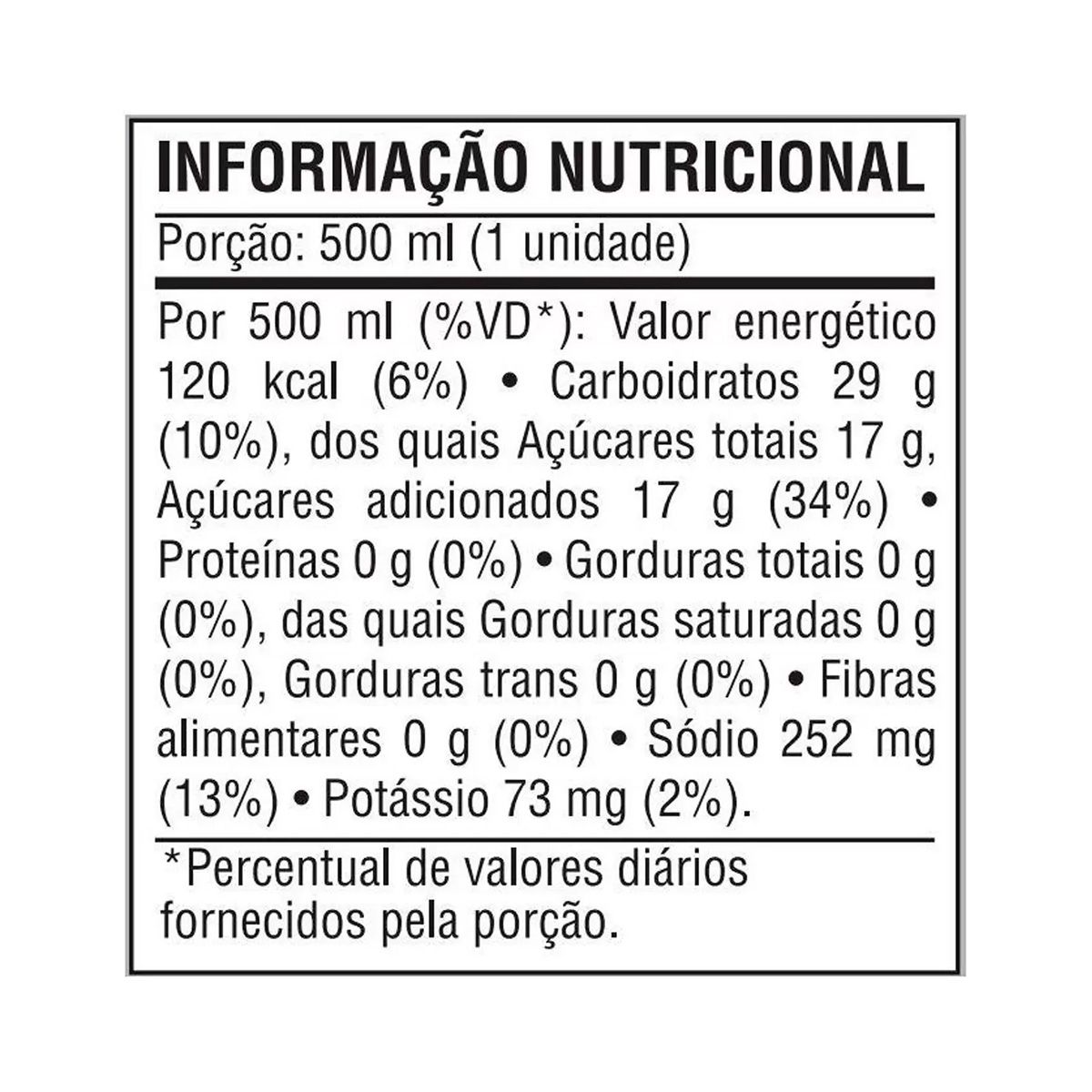 Os ingredientes incluem água, sacarose, maltodextrina, citrato de sódio, fosfato de potássio monobásico, aromatizantes, acidulante ácido cítrico, edulcorantes e corante azul brilhante. -