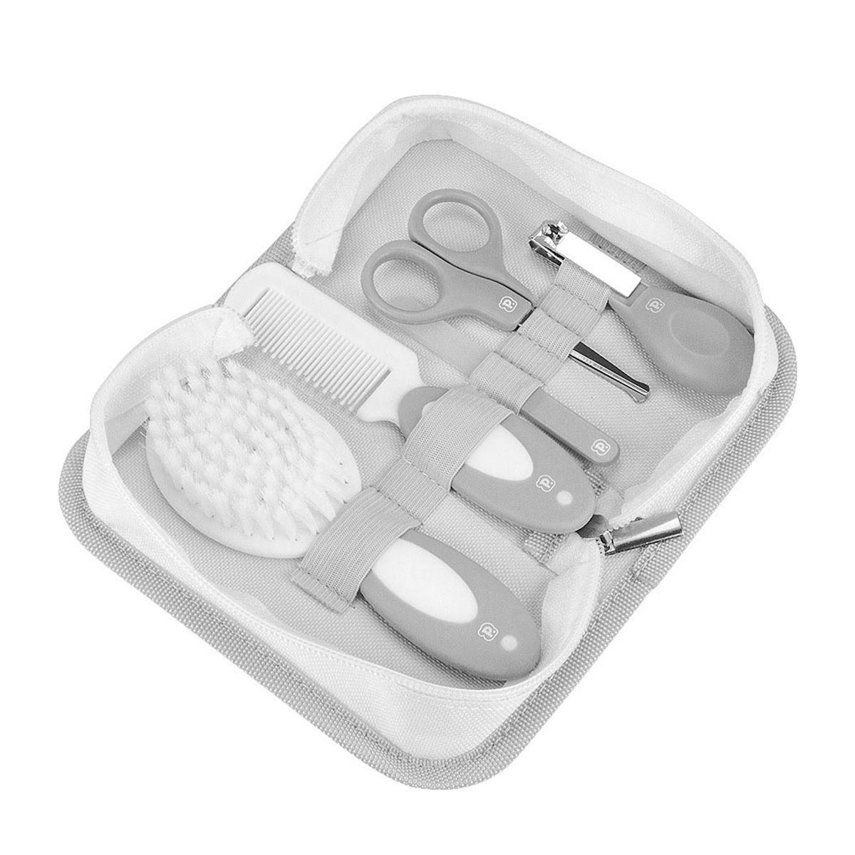 O kit inclui 1 pente, 1 escova de cabelo, 1 tesoura infantil, 1 cortador de unhas, 1 lixa de vidro e 1 nécessaire cinza. -