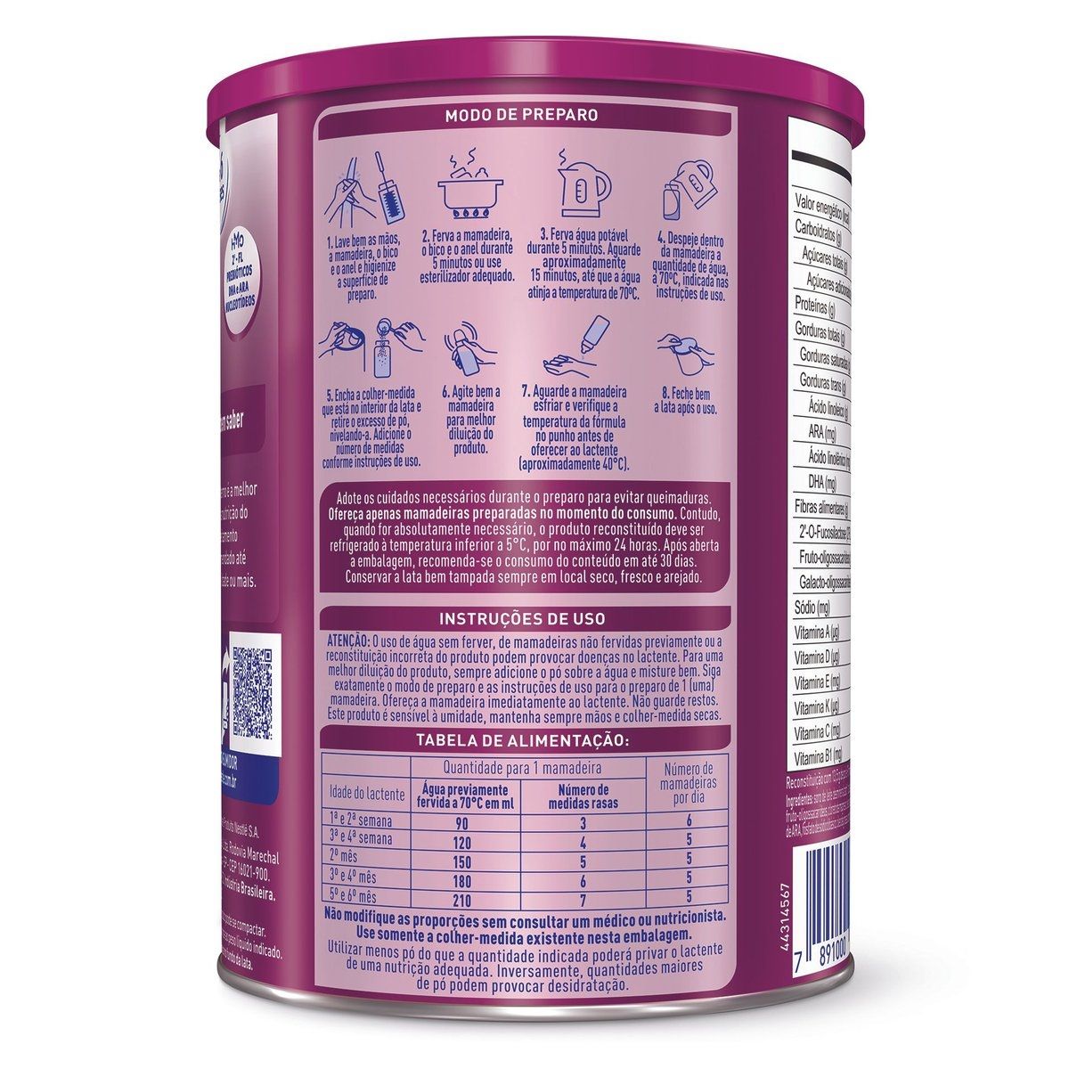 | Composição | Com ARA, Com Biotina, Com Cálcio, Com Cobre, Com DHA, Com Ferro, Com Fibra, Com Fósforo, Com Iodo, Com Magnésio, Com Nucleotídeos, Com Óleo de Palma, Com Potássio, Com Prebióticos, Com Selênio, Com Sódio, Com Vitamina A, Com Vitamina B1, Com Vitamina B12, Com Vitamina B2, Com Vitamina B3, Com Vitamina B6, Com Vitamina C, Com Vitamina D, Com Vitamina E, Com Vitamina K, Com Zinco |