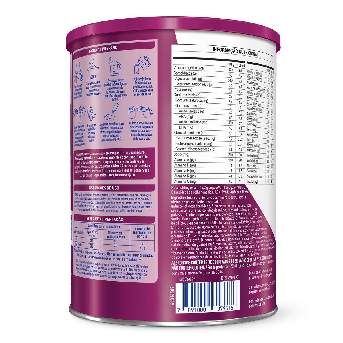 Ingredientes: Soro de leite desmineralizado*, lactose, oleína de palma, leite desnatado*, galacto-oligossacarídeos, óleo de palmiste, óleo de canola com baixo teor erúcico, óleo de milho, citrato de cálcio, fosfato de potássio, fruto-oligossacarídeos, cloreto de magnésio, fosfato de sódio, óleo de peixe com alto teor de DHA, 2’-O-fucosilactose**, cloreto de cálcio, L-ascorbato de sódio, fosfato de cálcio dibásico, L-fenilalanina, L-histidina, óleo de Mortierella Alpina com alto teor de ARA, cloreto de potássio, óleo de girassol com alto teor oleico, sulfato ferroso, sulfato de zinco, acetato de DL-a-tocoferila, citidina 5-monofosfato***, sal dissódico de uridina 5-monofosfato***, D-pantotenato de cálcio, nicotinamida, adenosina 5-monofosfato***, sal dissódico de guanosina 5-monofosfato***, sulfato de cobre, tiamina mononitrato, acetato de retinila, cloridrato de piridoxina, riboflavina, ácido N-pteroil-L-glutâmico, iodeto de potássio, fitomenadiona, D-biotina, selenato de sódio, colecalciferol, cianocobalamina, emulsificante lectina de soja e reguladores de acidez hidróxido de potássio e ácido cítrico. *Fontes proteicas. **2’-O-fucosilactose: Oligossacarídeos. ***Nucleotídeos