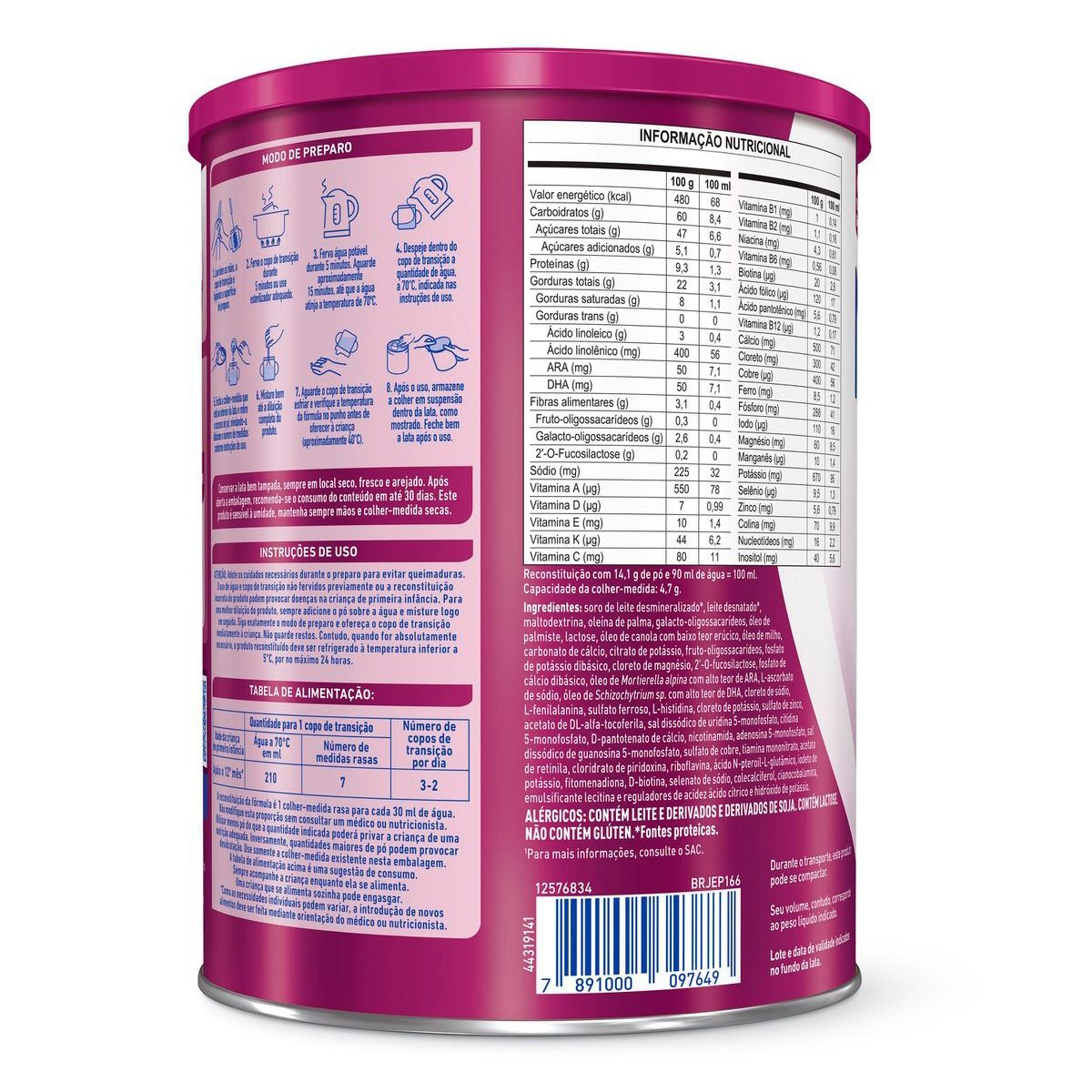 | Composição | Com ARA, Com Biotina, Com Cálcio, Com Cobre, Com DHA, Com Ferro, Com Fibra Prebiótica, Com Fósforo, Com Iodo, Com Magnésio, Com Maltodextrina, Com Nucleotídeos, Com Óleo de Girassol, Com Óleo de Palma, Com Potássio, Com Prebióticos, Com Selênio, Com Sódio, Com Vitamina A, Com Vitamina B1, Com Vitamina B12, Com Vitamina B2, Com Vitamina B3, Com Vitamina B5, Com Vitamina B6, Com Vitamina B9, Com Vitamina C, Com Vitamina D, Com Vitamina E, Com Vitamina K, Com Zinco |