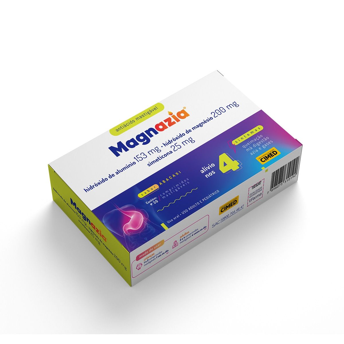 Magnazia é uma formulação com propriedades antiácidas e antiflatulentas, pois contém hidróxido de alumínio, hidróxido de magnésio e simeticona. O hidróxido de alumínio e o hidróxido de magnésio neutralizam a acidez gástrica (do estômago) e a simeticona, um polímero de sílica, é importante no tratamento da aerofagia (ingestão de ar), promovendo a eliminação dos gases excessivos acumulados no trato gastrointestinal (trato digestivo), que contribuem para o aumento da acidez local.