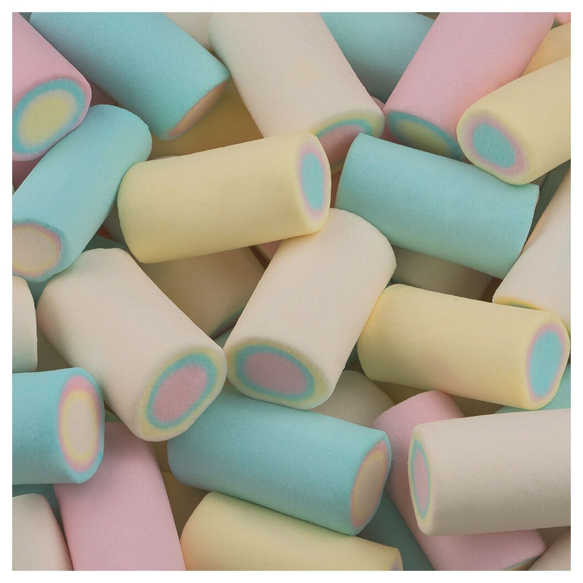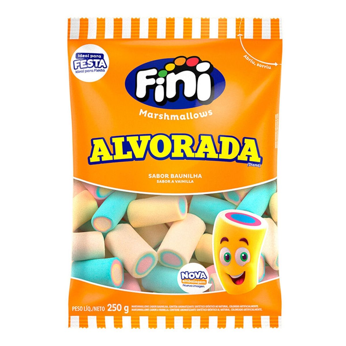 Marsh. Alvorada Fini, macios e saborosos, possuem formato de cilindro. No pacote contém Marsh. Alvorada, nas cores azul, amarelo, branco e rosa, com sabor de baunilha. Ideal para deixar o dia mais doce. É perfeito para usar em decorações.
