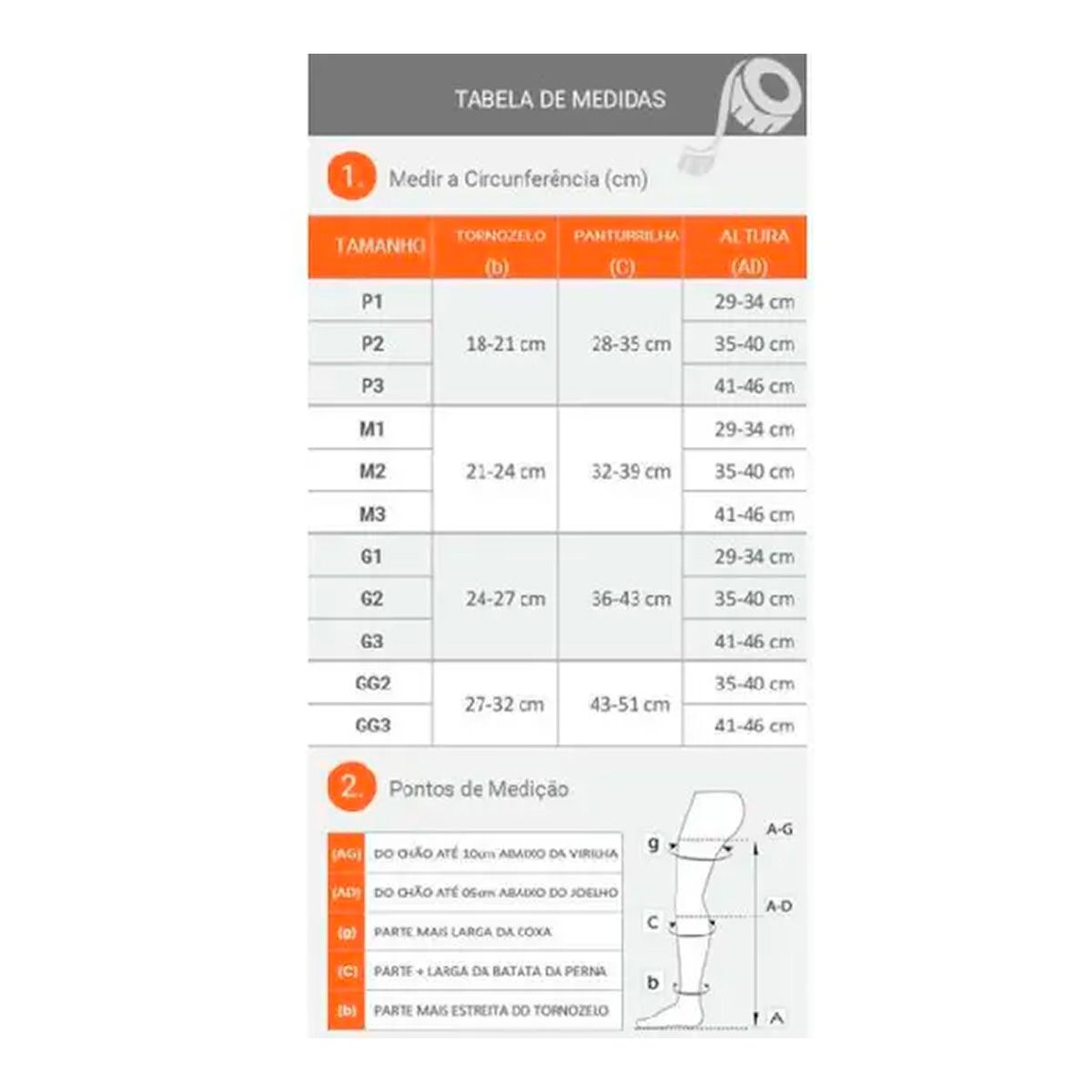 A meia oferece uma compressão média de 20-30mmHg, ideal para aliviar cansaço, reduzir peso nas pernas e tratar varizes. -