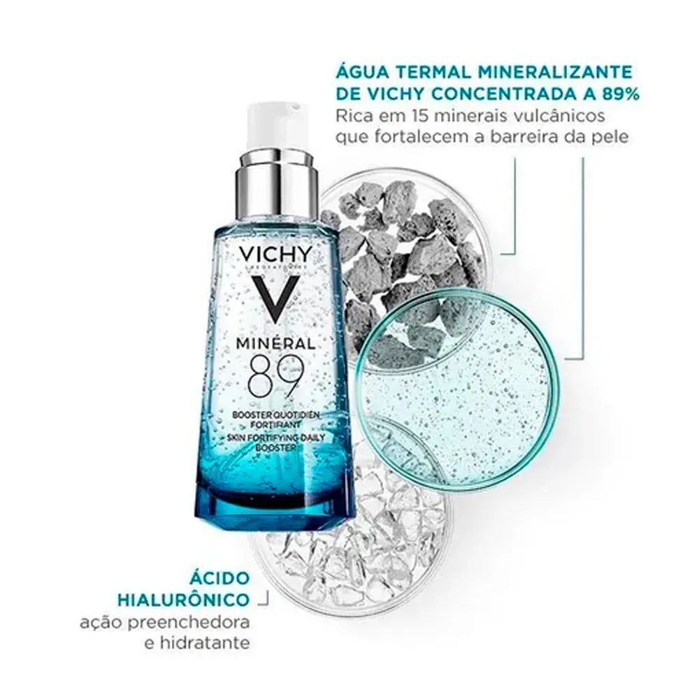 O Minéral 89 Vichy oferece hidratação intensa, maior maciez, luminosidade e proteção contra poluição, além de revitalizar e defender a pele de agentes externos. -