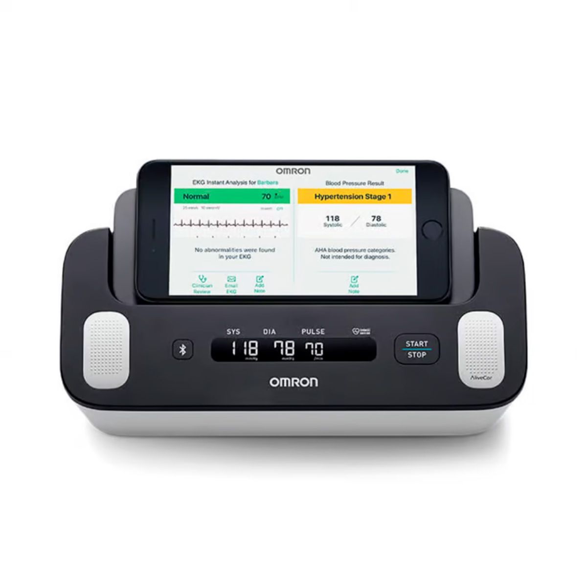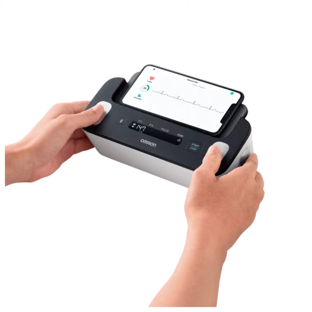 Com o OMRON Complete, é possível realizar um eletrocardiograma e aferir a pressão arterial simultaneamente, incluindo detecção de fibrilação atrial e arritmias cardíacas, com apenas um único aparelho.