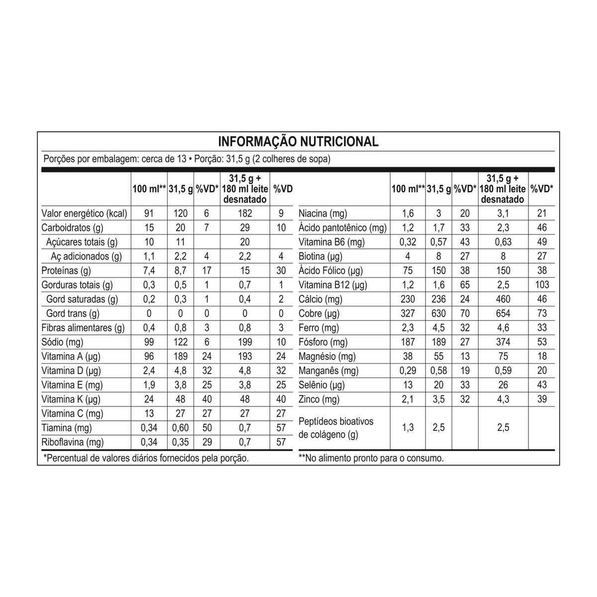 Ingredientes: Leite em pó desnatado, maltodextrina, cacau em pó, peptídeos bioativos de colágeno hidrolisado com peso molecular médio de 2kDa, minerais (fosfato de cálcio tribásico, óxido de magnésio, pirofosfato férrico, óxido de zinco, sulfato cúprico, sulfato de manganês e selenito de sódio), vitaminas (L ascorbato de sódio, acetado de DL-alfa-tocoferila, nicotinamida, D-pantotenato de cálcio, cloridrato de piridoxina, cloridrato de tiamina, palmitato de retinila, riboflavina, ácido fólico, fitomenadiona, D biotina, colecalciferol e cianocobalamina), aromatizantes e edulcorante sucralose.