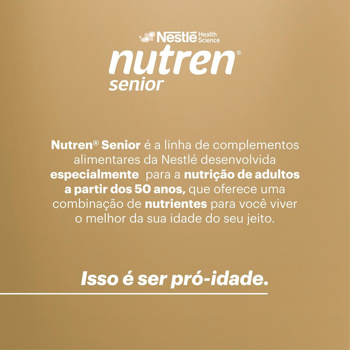 NUTREN® Senior é o suplemento nutricional da Nestlé desenvolvido pensando nas necessidades nutricionais de quem já passou dos 50 anos e ainda tem muito o que aproveitar. A melhor fase da vida é agora!