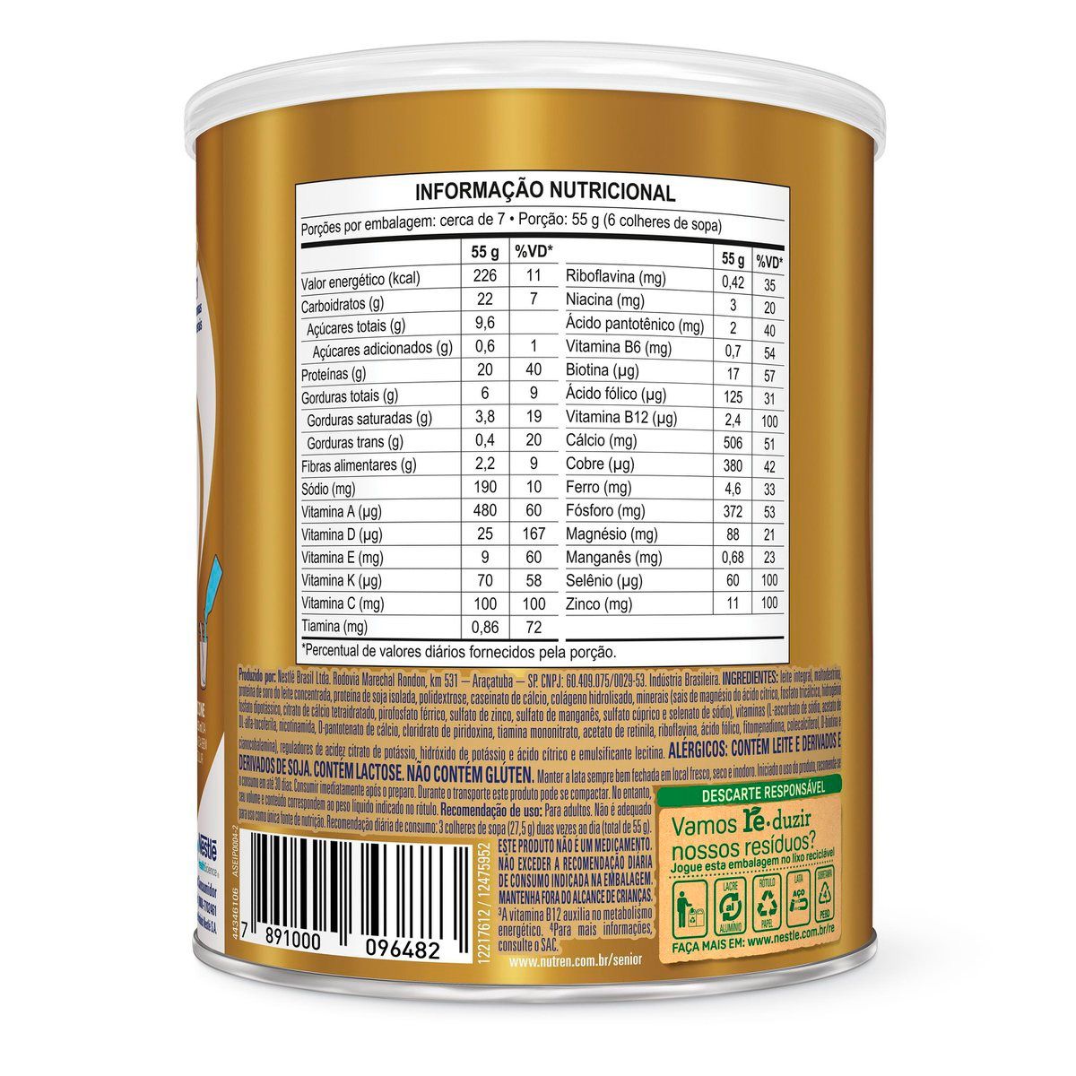 Ingredientes: Leite integral, maltodextrina, proteína de soro do leite concentrada, proteína de soja isolada, polidextrose, caseinato de cálcio, colágeno hidrolisado, minerais (sais de magnésio do ácido cítrico, fosfato tricálcico, hidrogênio fosfato dipotássico, citrato de cálcio tetraidratado, pirofosfato férrico, sulfato de zinco, sulfato de manganês, sulfato cúprico e selenato de sódio), vitaminas (L-ascorbato de sódio, acetato de DL-alfa-tocoferila, nicotinamida, D-pantotenato de cálcio, cloridrato de piridoxina, tiamina mononitrato, acetato de retinila, riboflavina, ácido fólico, fitomenadiona, colecalciferol, D-biotina e cianocobalamina), reguladores de acidez citrato de potássio, hidróxido de potássio e ácido cítrico e emulsificante lecitina.