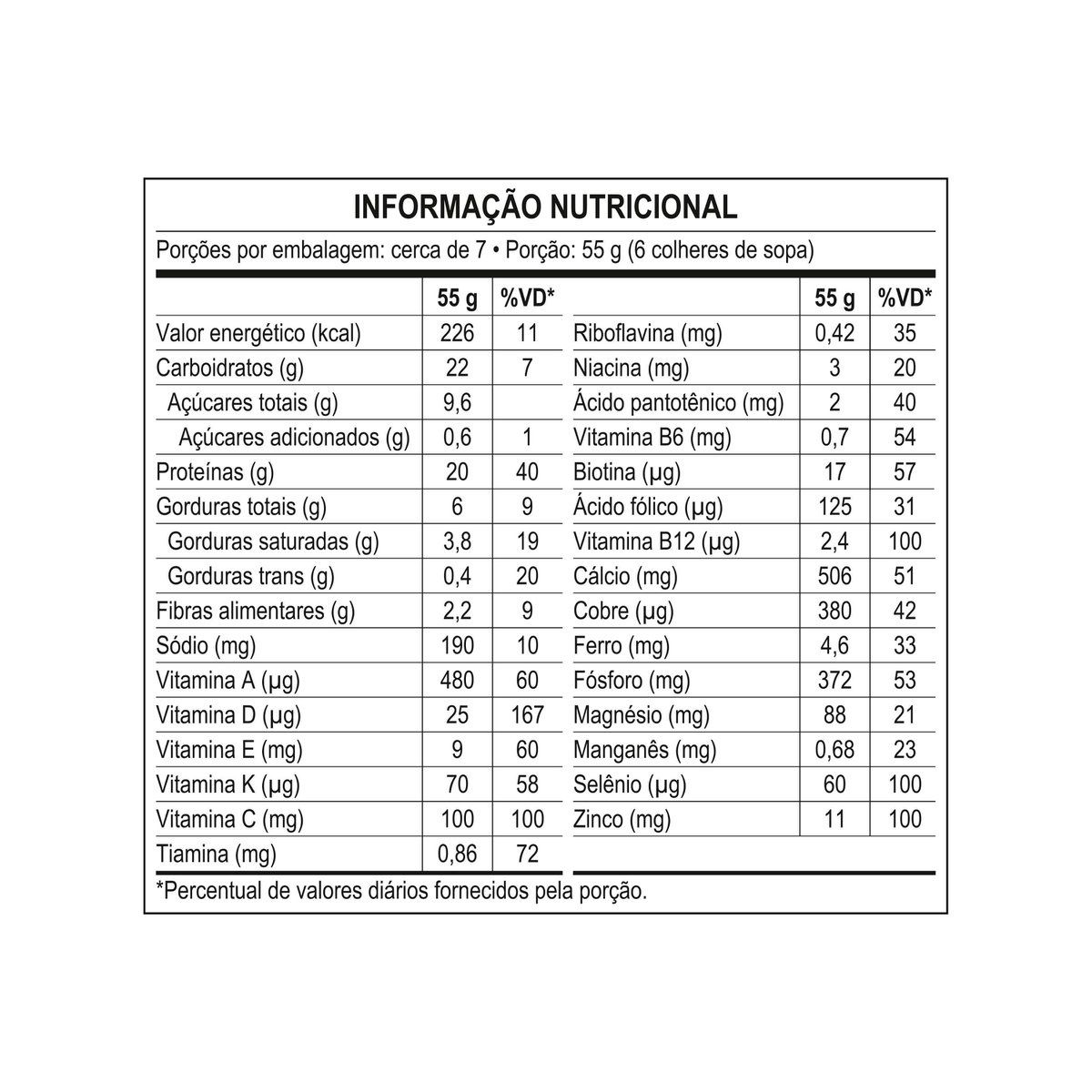 | Composição | Com Ácido Pantotênico, Com Biotina, Com Cálcio, Com Carboidrato, Com Cobre, Com Ferro, Com Fibras, Com Fósforo, Com Magnésio, Com Manganês, Com Niacina, Com Proteína, Com Selênio, Com Sódio, Com Vitamina A, Com Vitamina B1, Com Vitamina B12, Com Vitamina B2, Com Vitamina B6, Com Vitamina C, Com Vitamina D, Com Vitamina E, Com Vitamina K, Com Zinco |