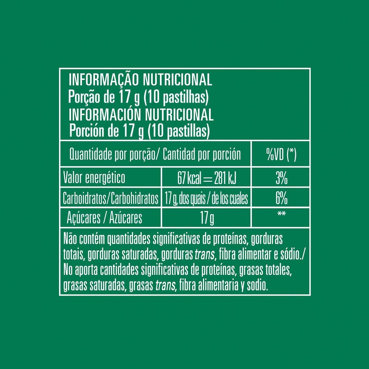 Contém açúcar, dextrina, antiaglutinante estearato de magnésio (470i) e aromatizante. Não contém gorduras, proteínas e sódio. -
