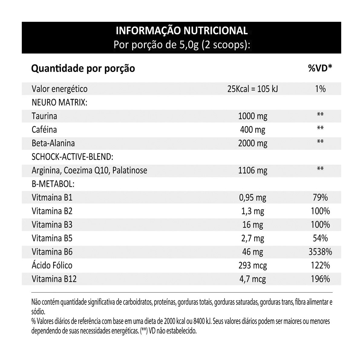 Os ingredientes incluem Alanina, Taurina, Cafeína Anidra, Arginina, Isomaltulose, Coenzima Q10 e várias vitaminas do complexo B. -