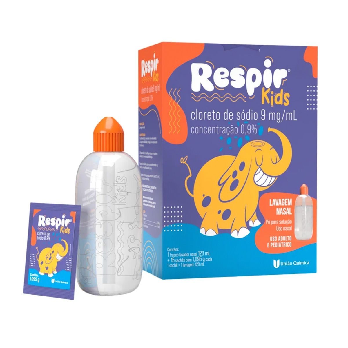 Respir Kids Cloreto de Sódio 0,9% Pó para Solução Nasal Com 15 Sachês e frasco 120ml União Química