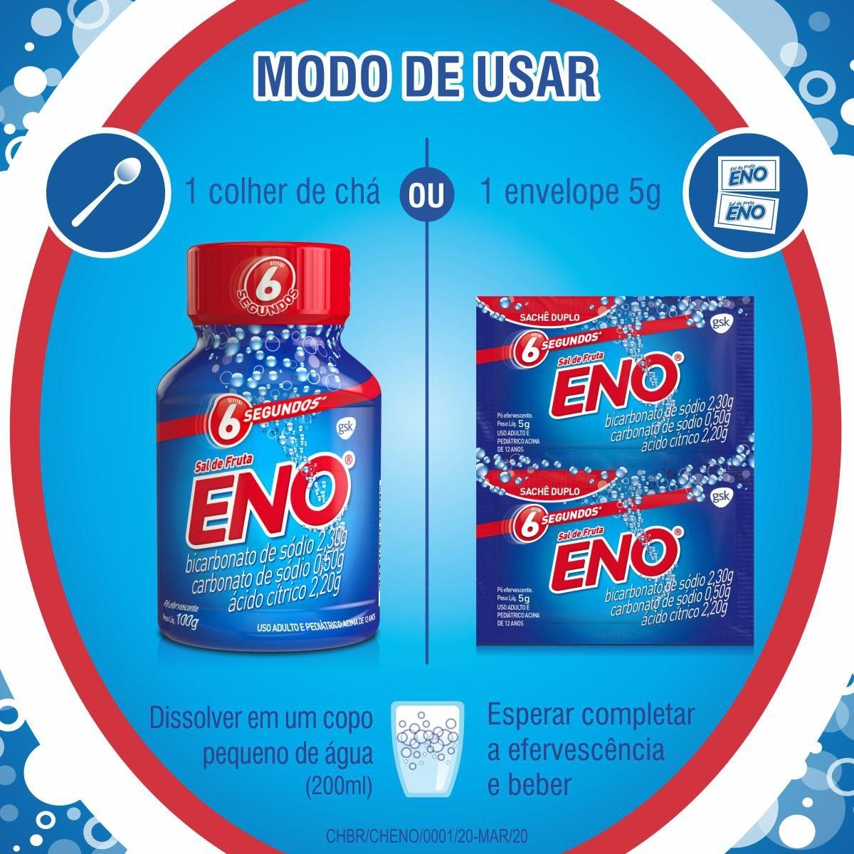 Quando os sintomas ocorrerem, você deve dissolver 5 g (conteúdo de 1 envelope ou 1 colher de chá) de Sal de Fruta Eno em um copo pequeno de água (200 ml), esperar completar a efervescência e beber de uma vez, podendo repetir o uso após 2 horas, se necessário.