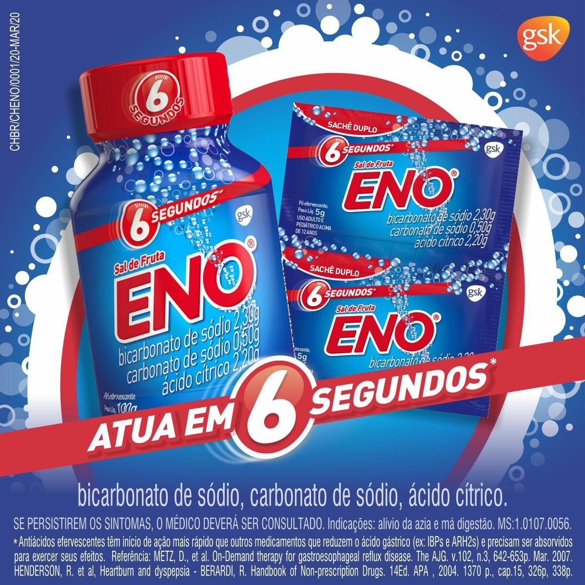 Os componentes do Sal de Fruta Eno, quando dissolvidos em água, reagem entre si, produzindo um sal de efeito antiácido, capaz de iniciar a redução da acidez do estômago em 6 segundos.