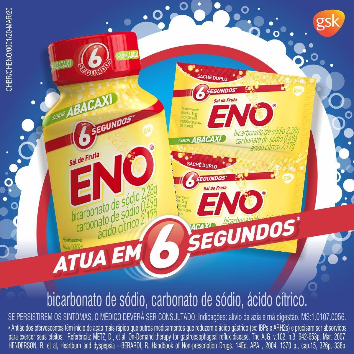 Os componentes do Sal de Fruta Eno, quando dissolvidos em água, reagem entre si, produzindo um sal de efeito antiácido, capaz de iniciar a redução da acidez do estômago em 6 segundos.