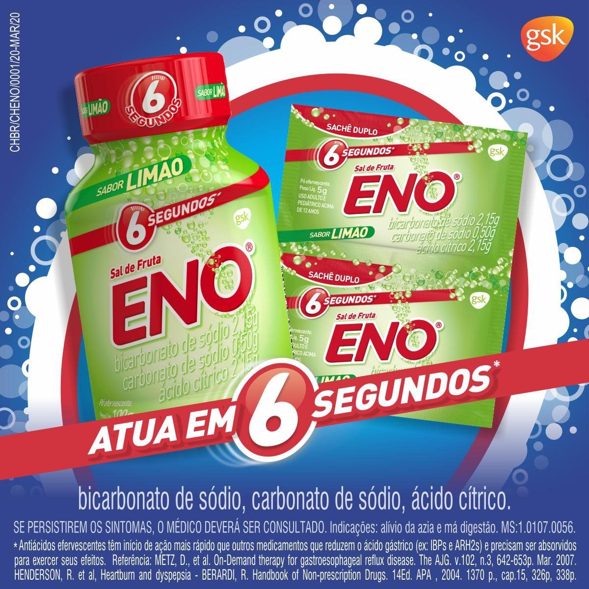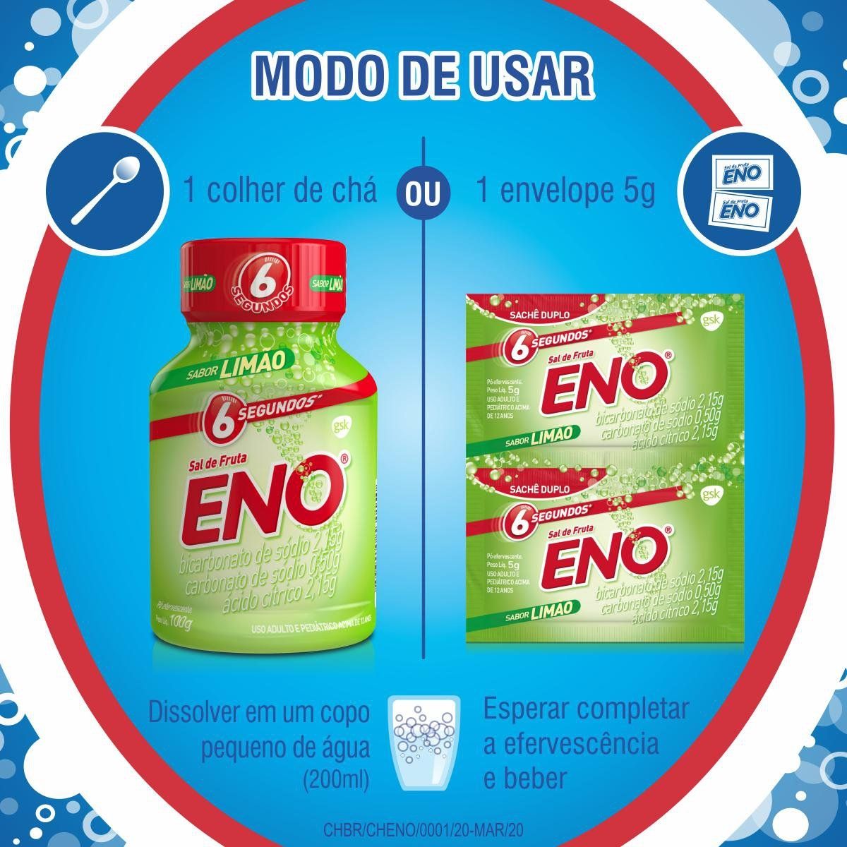 Quando os sintomas ocorrerem, você deve dissolver 5 g (conteúdo de 1 envelope ou 1 colher de chá) de Sal de Fruta Eno em um copo pequeno de água (200 ml), esperar completar a efervescência e beber de uma vez, podendo repetir o uso após 2 horas, se necessário.
