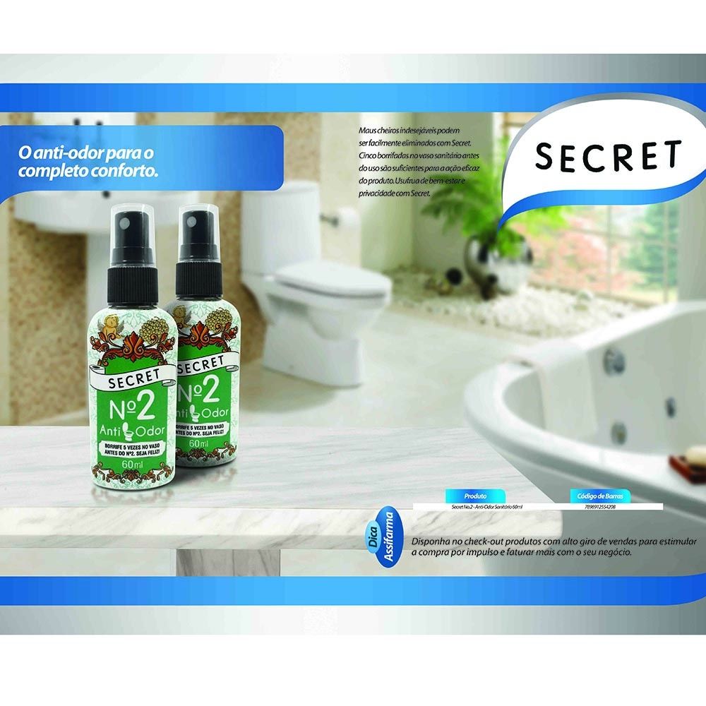 O Secret Nº2 Antiodor 60Ml é a solução ideal para eliminar odores desagradáveis e prevenir constrangimentos. Fácil de usar, basta borrifar cinco vezes na água antes de usar o vaso sanitário. Compacto e discreto, é perfeito para levar em qualquer lugar e usar diariamente sem preocupações. Ao escolher, considere sua necessidade de discrição e a frequência de uso. O Secret Nº2 é eficaz e prático, o que o torna indispensável para uma rotina mais leve e sem preocupações.