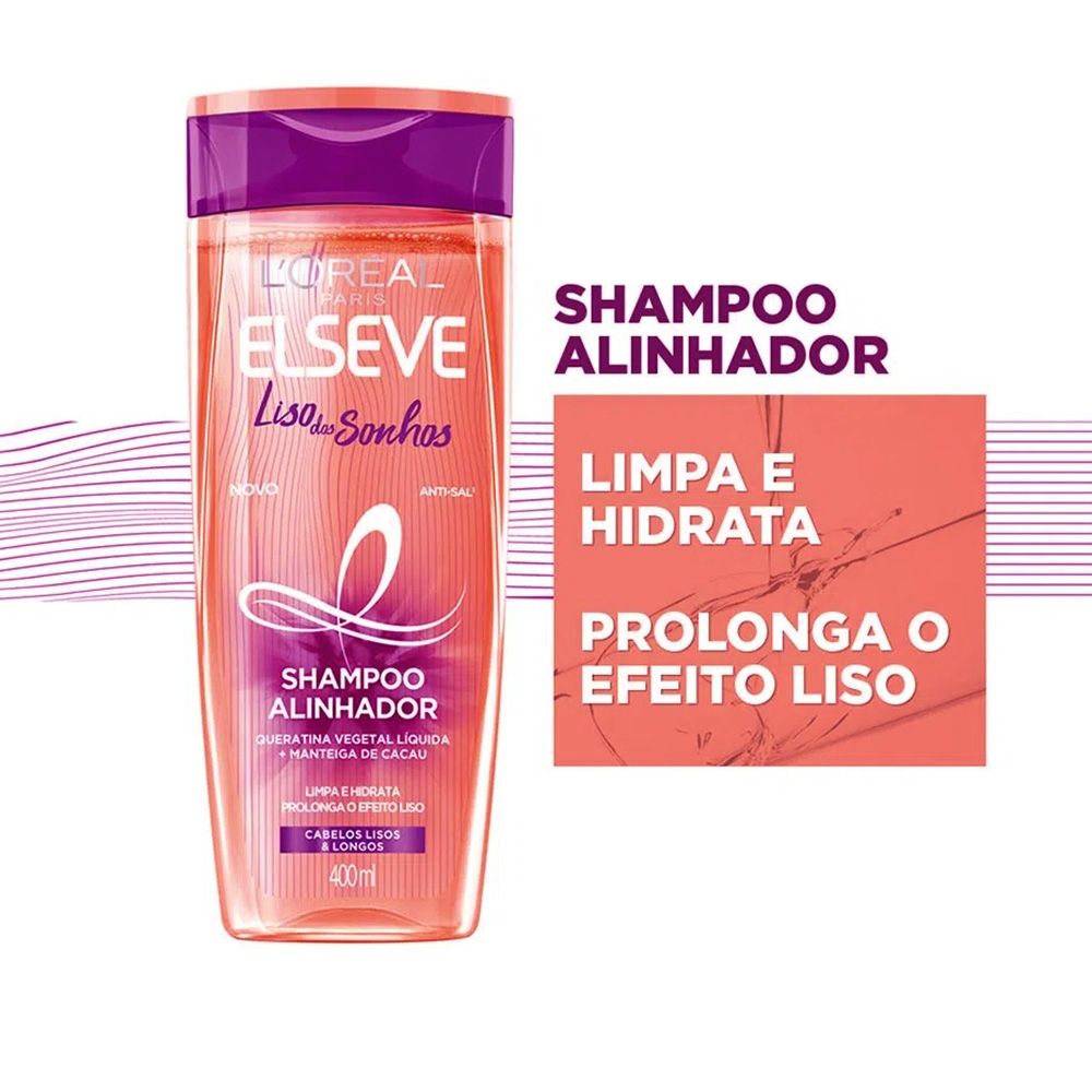 Descubra o Shampoo Elseve Liso dos Sonhos 400ml da L'Oréal Paris. Com benefícios incríveis, ele remove curvas indesejadas, controla o frizz, alinha os fios, nutre e alonga, garantindo cabelos lisos e saudáveis. Para escolher o ideal, considere suas necessidades: cabelos lisos e sem frizz. Aplique nos cabelos molhados, massageie e enxágue. Repita se necessário.