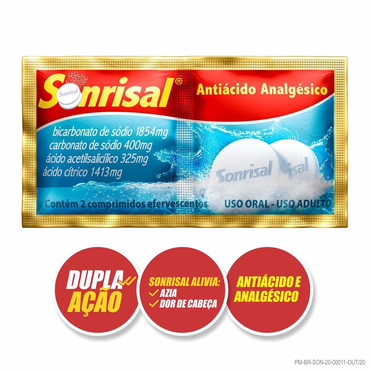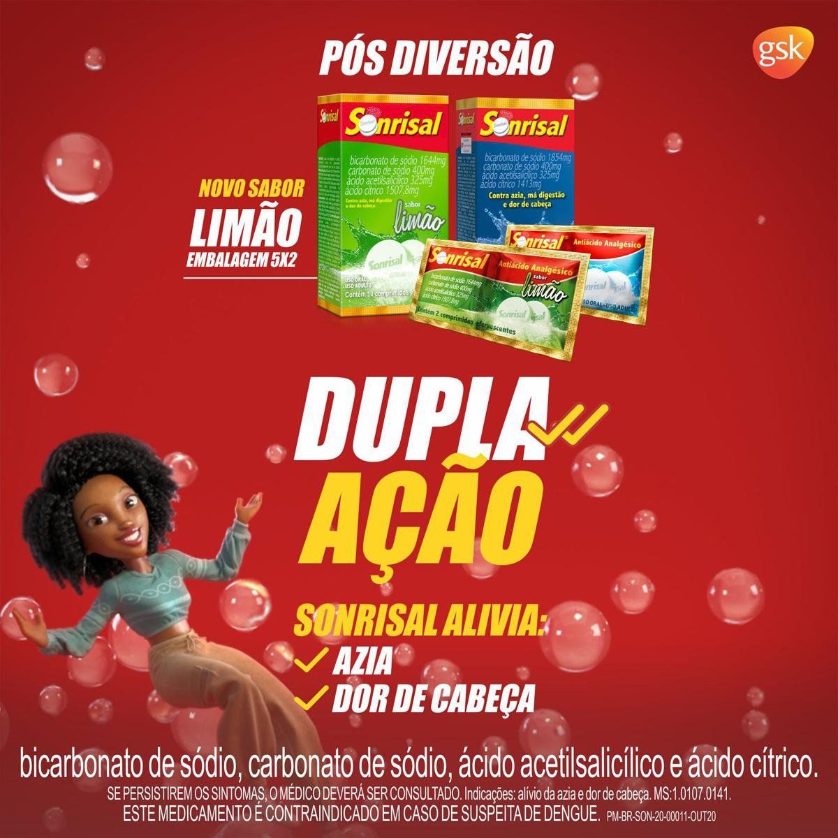 O Sonrisal Sabor Tradicional alivia rapidamente azia, má digestão, dores de cabeça e sintomas de ressaca, graças à sua ação antiácida e efervescente. -