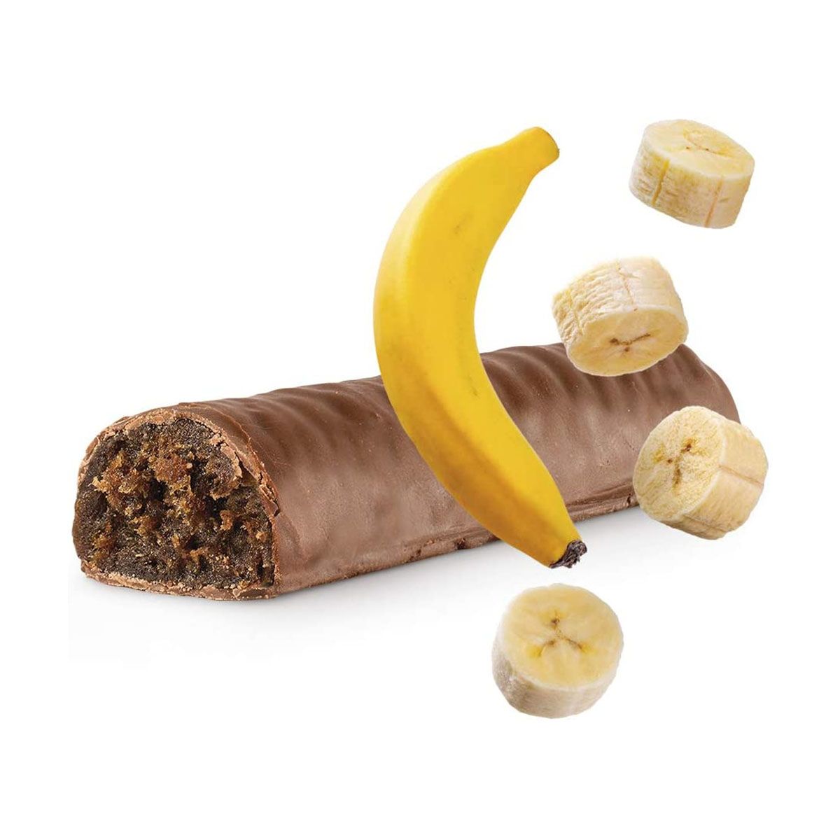 A barra combina banana desidratada e chocolate, fornecendo potássio, fibras e vitamina B, ideal para uma alimentação equilibrada. -