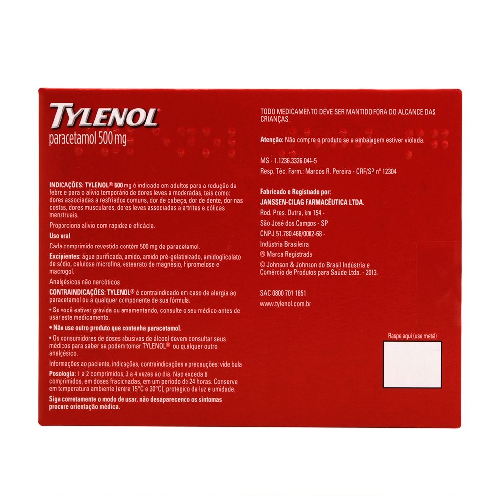 Tome 1 a 2 comprimidos de Tylenol 500mg 3 a 4 vezes ao dia, sem exceder 8 comprimidos diários. Não é necessário tomar com alimentos. -